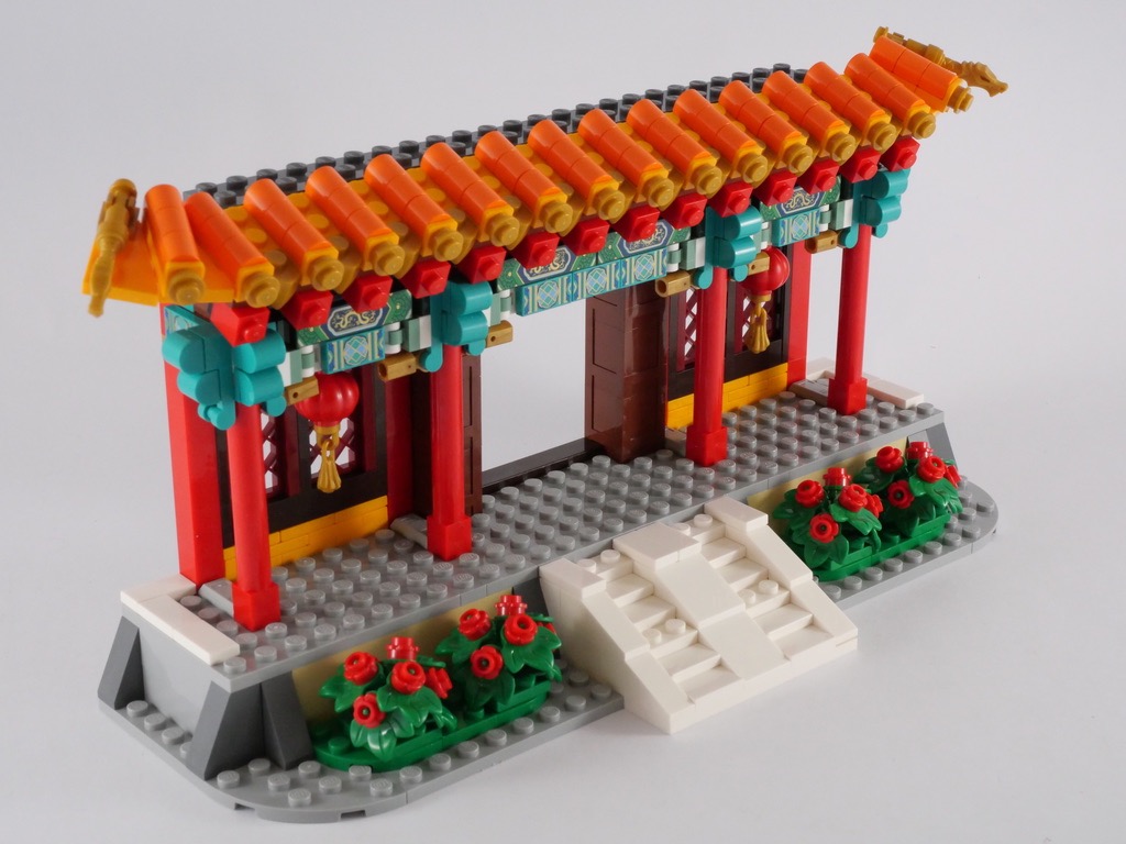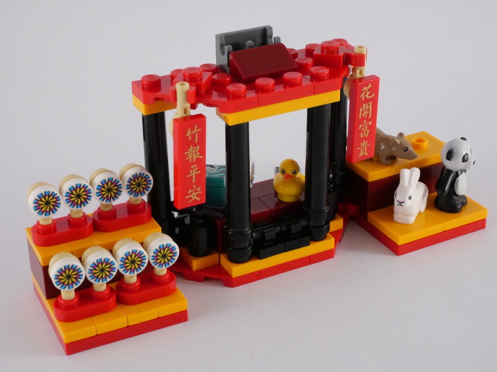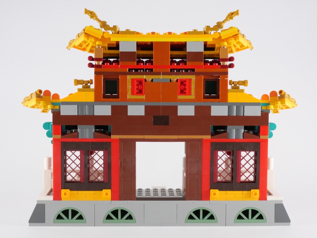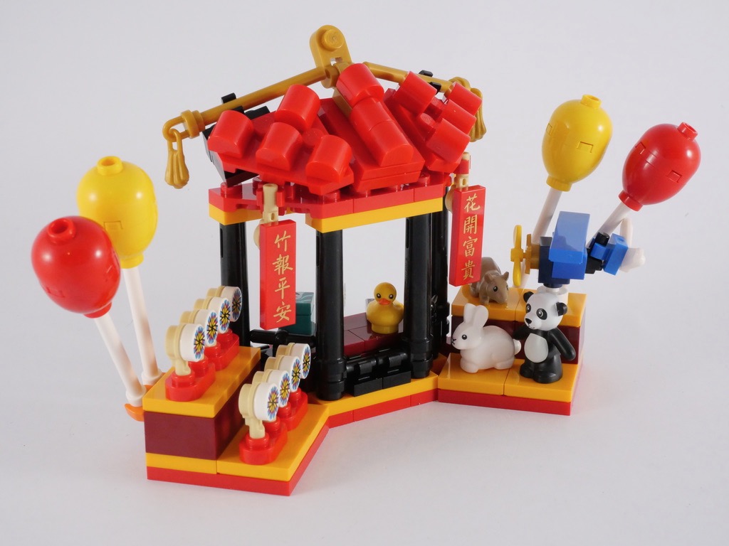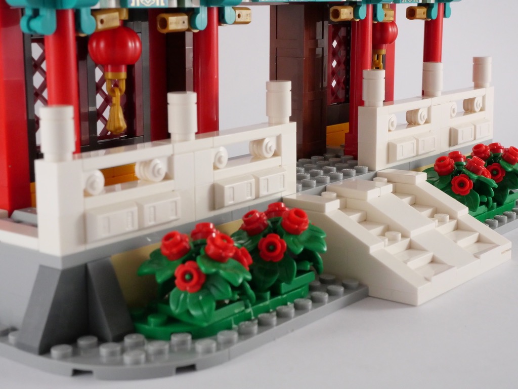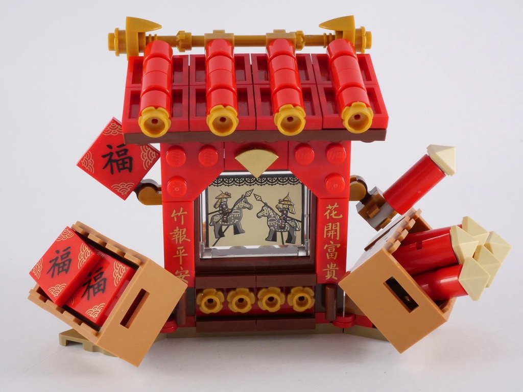 La jouabilité est également un des points forts de ce set. En particulier grâce au nombre de minifigs qu’il contient. Mais également grâce à la variété des stands et des accessoires qu’on y trouve : de la nourriture, de jouets, des peluches, des feux d’artifice, de la vaisselle et j’en passe. On pourra s’amuser avec un marionnettiste dans son théâtre, avec un vendeur de brochettes derrière son stand, ou avec les grands-parents se rendant au temple. N’espérez cependant pas faire grand-chose dans ce dernier, puisque seule la façade est représentée. Ce qui peut aisément se comprendre, aménager un temple entier avec son intérieur aurait très certainement fait enfler le prix de manière considérable. On aurait tout de même aimé quelques espaces jouables au dos, mais il n’en est rien.