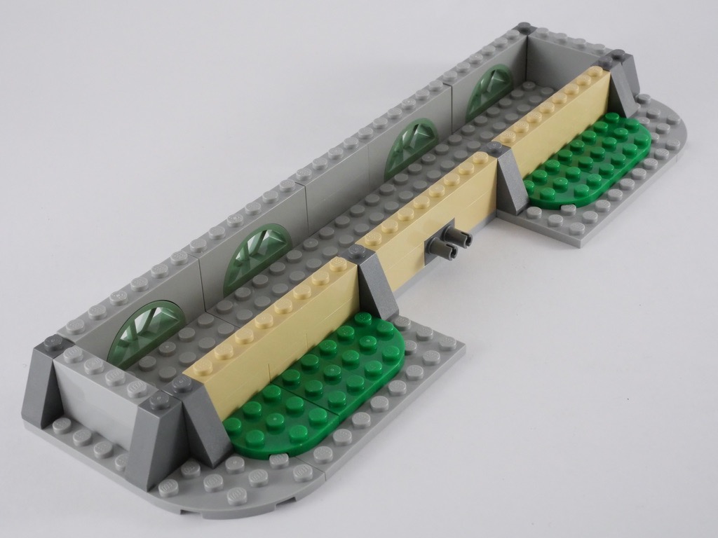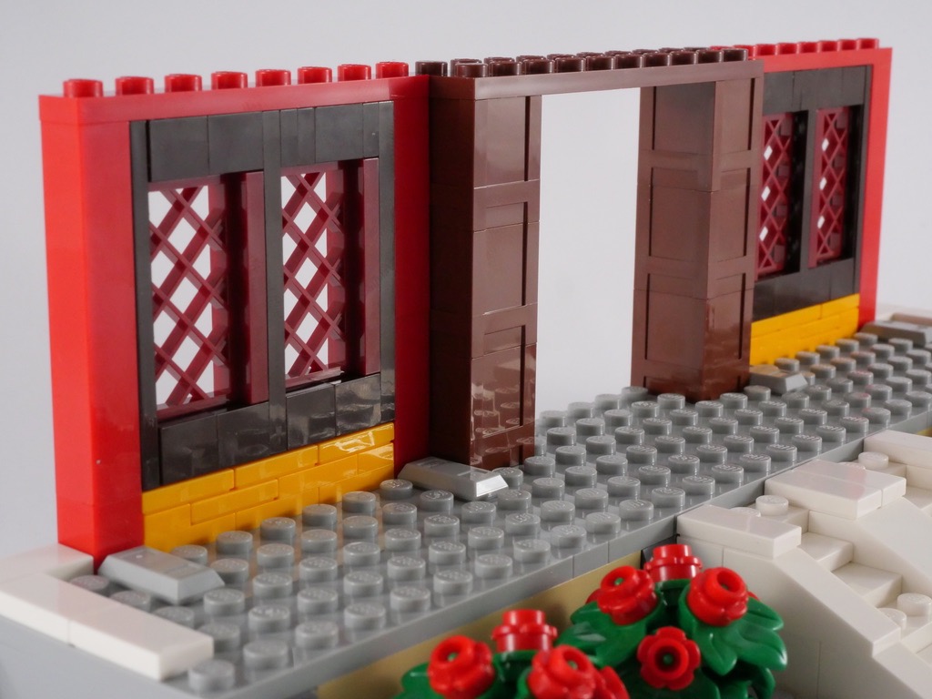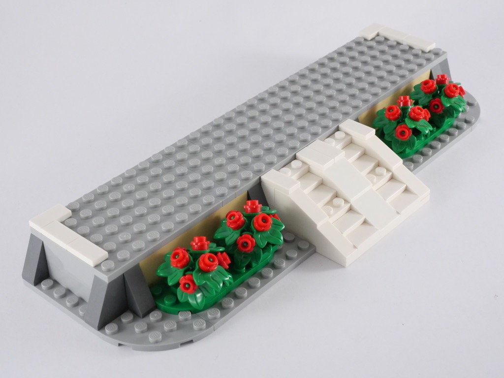 Ou plutôt la façade de celui-ci, comme cela ne vous aura pas échappé. C’est le gros morceau du modèle, qui s’étale sur 5 sachets de pièces parmi les 9 contenus dans la boîte. Nous commençons par sa base, constituée de plates grises, de murs tan et gris, et de lucarnes côté arrière. Un escalier monumental blanc est fixé sur l’avant grâce à deux pins Technic, et quelques fleurs (un peu pénibles à assembler, soit dit en passant) décorent les plates-bandes.