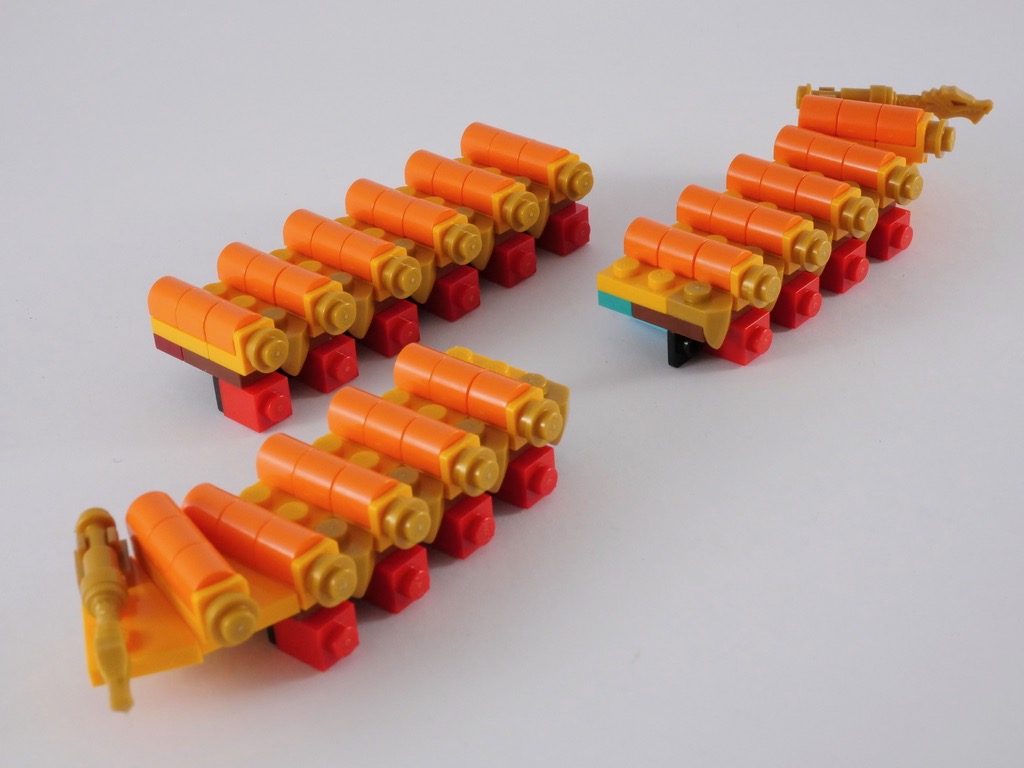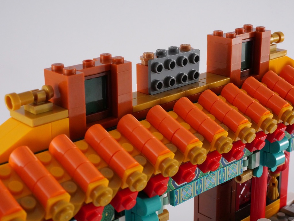 Nous nous occupons ensuite du premier pan de toiture, le plus bas. Celui-ci est assemblé en 3 morceaux, les 2 parties extérieures disposant d’un pan coupé réalisé par une charnière. Sur la partie supérieure, on retrouve les pièces semi-cylindriques déjà vues sur le stand de jouets. Le mélange entre la couleur bright orange de celles-ci, flame yellowish orange de la plate située au-dessous, et des pièces dorées et rouges sur la tranche est vraiment sympa. Les 3 sous-ensembles sont clipsés sur la façade du temple. Vous vous doutez que comme souvent lors de la réalisation des toitures, tout ceci est assez répétitif. Mais le jeu en vaut la chandelle.