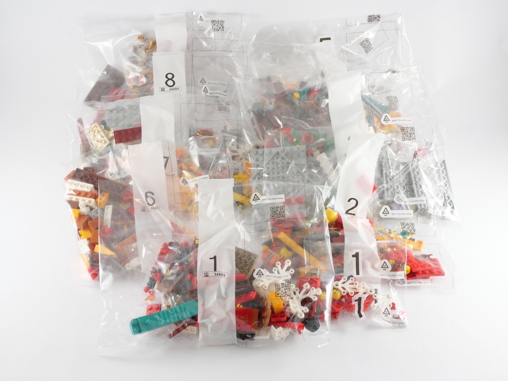 A l’intérieur, nous trouvons 10 sachets de pièces numérotés de 1 à 9. Seul le numéro 1 est « doublé ». Dans une pochette plastique séparée sont présentées les 3 notices d’instructions, deux petites pour les petites constructions, et une plus grande pour le temple. Premier bon point : pas l’ombre d’un autocollant.