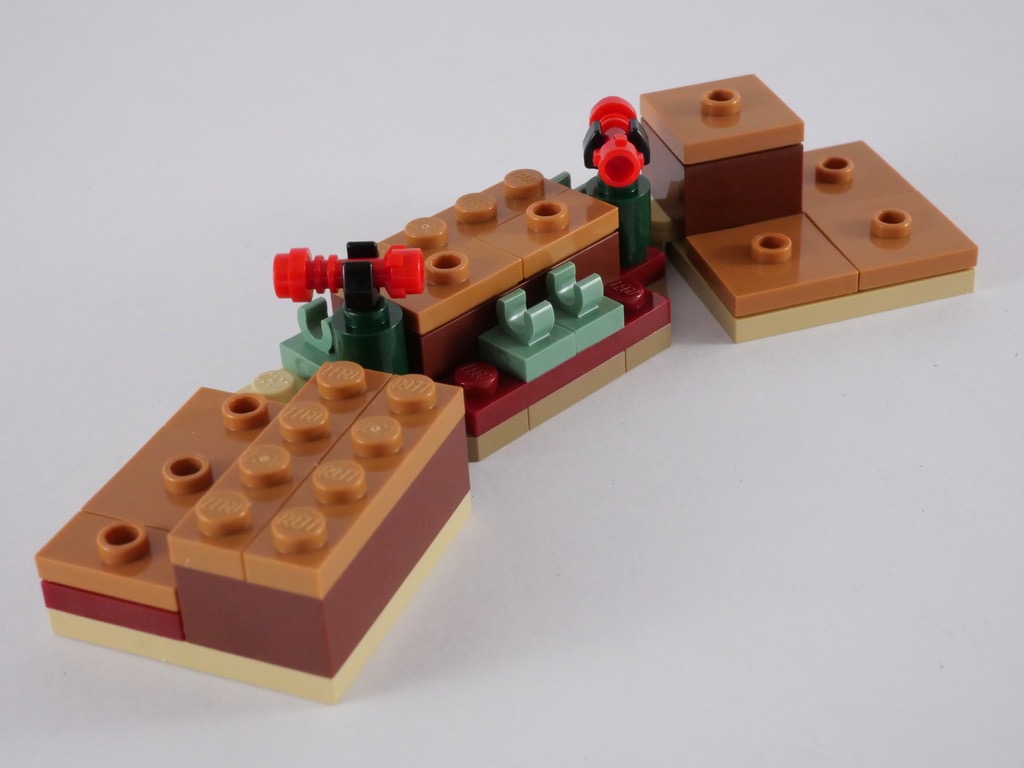 Nous nous attaquons ensuite au premier stand, qui vend de la nourriture. Dans sa partie basse, le designer est même allé jusqu’à intégrer une jauge de température, et une petite flamme cachée sous la grille. Les brochettes sont clipsées au-dessus de celle-ci. Nous construisons alors la toiture superbement réalisée, à l’aide de 3.2 Shaft W/3.2 Hole superposés. Sa construction est un peu répétitive, mais le résultat est à la hauteur. Nous terminons en ajoutant sur les deux côtés du stand d’autres denrées à vendre, dont des biscuits, des bonbons et de petits pains décorés d’une tête d’ours.
