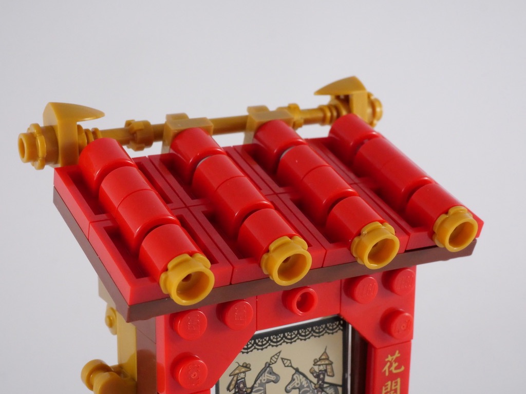 La construction commence avec un arbre aux feuilles blanches décorées de fleurs rouges. Sa conception est relativement intéressante : les 3 branches sont clipsées au tronc, les fleurs maintenant les feuilles en place. On y accroche également une lanterne et deux bannières tampographiées, l’une avec les écritures dorées et l’autre avec les écritures noires et un encadrement doré. Petit point négatif, je trouve que l’arbre aurait mérité un feuillage plus fourni.