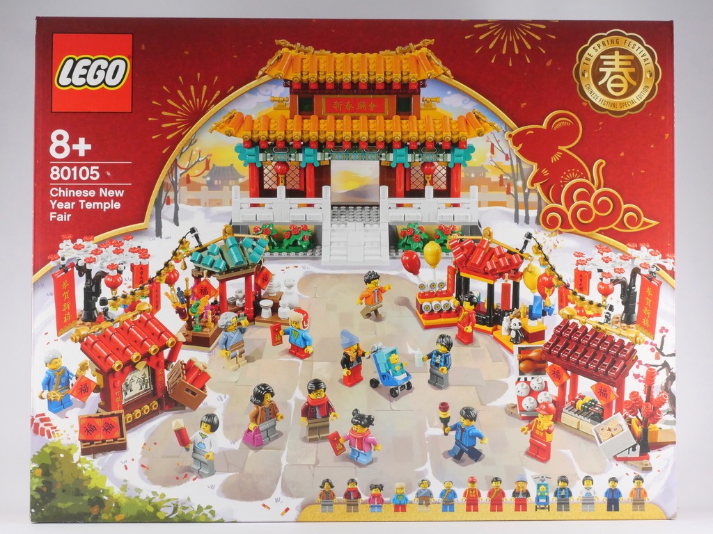 En Chine, le rouge est la couleur du bonheur. Et la couleur dominante de la boîte du set dont nous parlons aujourd’hui. Les nombreux passants sont mis en scène devant les différents étals et les arbres fleuris, tandis qu’on aperçoit un temple dans le fond. Un rat stylisé (nous sommes désormais dans l’année du rat) est présent en dessous du macaron portant l’inscription « The Spring Festival – Chinese Festival Special Edition ». En bas à droite, nous découvrons la ribambelle de minifigs : 14 au total !