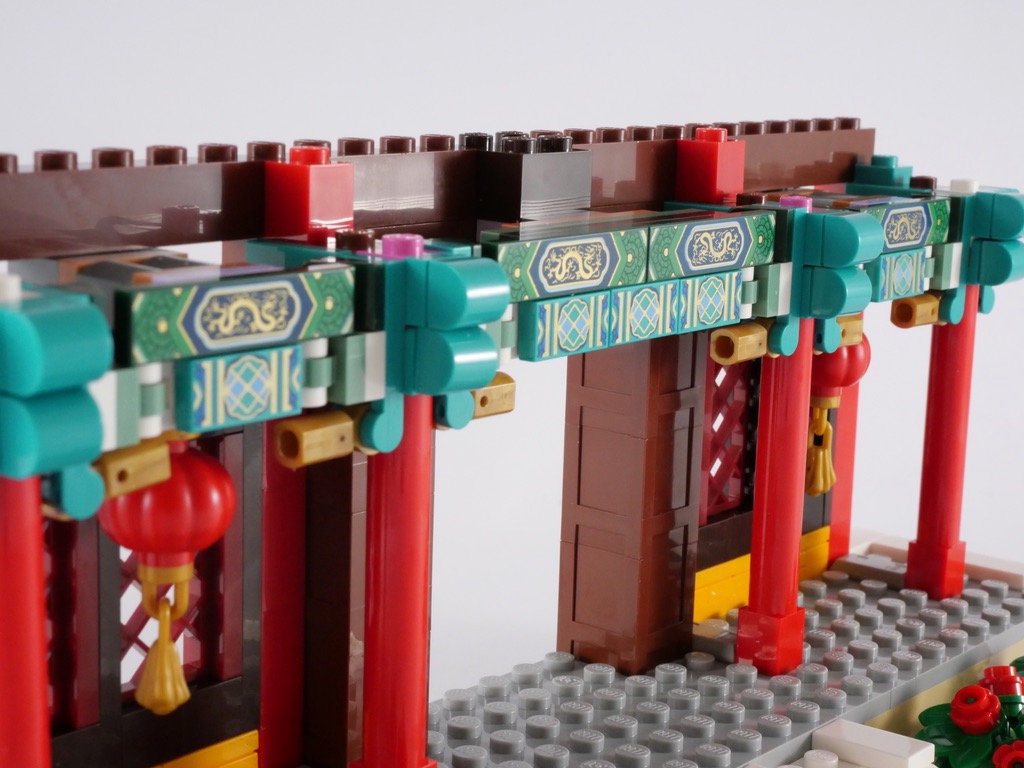 Nous élevons ensuite les façades, où l’on remarquera la manière de réaliser les 4 fenêtres à l’aide de clôtures disposées verticalement sur des briques SNOT. La conception des deux pilastres est également intéressante, à base de pièces servant habituellement de conteneur. Nous ajoutons ensuite une rangée de colonnes rouges, reliées à la façade précédemment construite pour une meilleure rigidité de l’ensemble. La partie supérieure de ces colonnes est décorée de pièces couleur teal et dark blue tampographiées, c’est vraiment sublimes. Ces 3 éléments sont construits indépendamment et fixés sur des briques SNOT entre les colonnes. Deux lanternes décorent la partie inférieure de ces élements, au-dessus du couloir créé entre les colonnes et la façade.