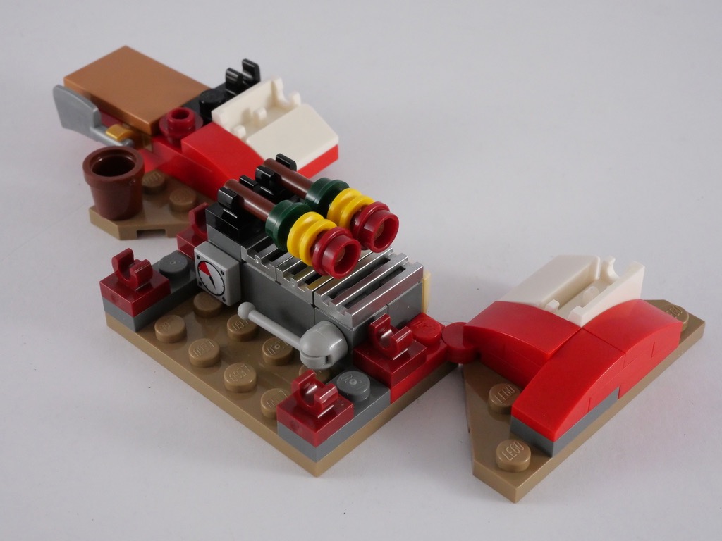 Nous nous attaquons ensuite au premier stand, qui vend de la nourriture. Dans sa partie basse, le designer est même allé jusqu’à intégrer une jauge de température, et une petite flamme cachée sous la grille. Les brochettes sont clipsées au-dessus de celle-ci. Nous construisons alors la toiture superbement réalisée, à l’aide de 3.2 Shaft W/3.2 Hole superposés. Sa construction est un peu répétitive, mais le résultat est à la hauteur. Nous terminons en ajoutant sur les deux côtés du stand d’autres denrées à vendre, dont des biscuits, des bonbons et de petits pains décorés d’une tête d’ours.