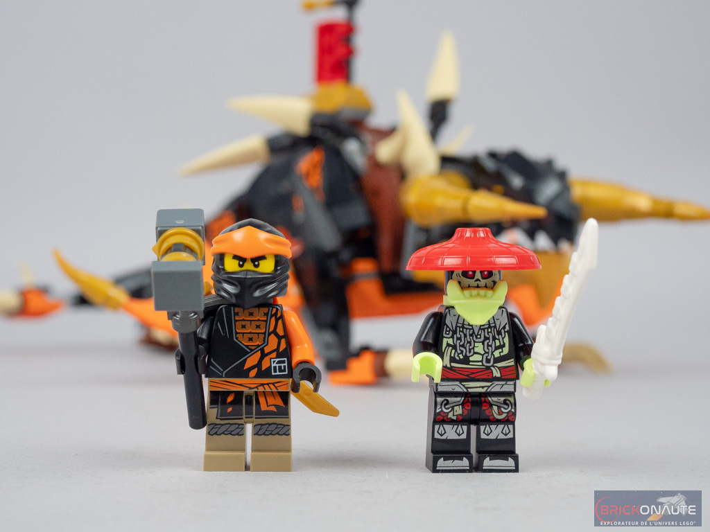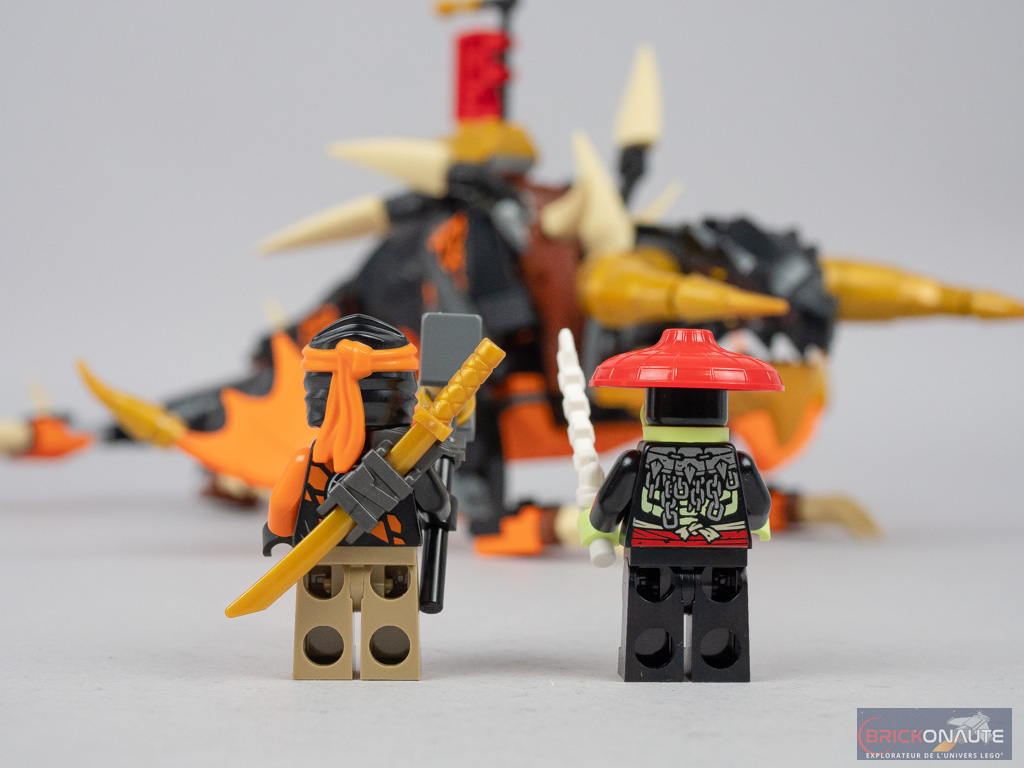Enfin, vous l’aurez compris, le dernier sachet de pièces est dédié à la seconde « évolution ». Une masse vient remplacer le katana de Cole, on ajoute également à notre dragon des grandes cornes, des petites ailes sur les pattes avant, une selle et une bannière. Et la construction s’achève ainsi. Une expérience de construction honnête pour une petite boîte comme celle-ci.