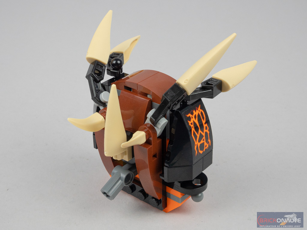 Si le dragon ne ressemble pas à grand-chose lors de ses deux premières « évolutions » (j’ai d’ailleurs toujours du mal à saisir ce que LEGO a voulu nous proposer avec ce concept…), il est finalement plutôt réussi une fois tous les éléments assemblés. Sa couleur sombre joue pour lui : les articulations grises en deviennent moins visibles que d’habitude.