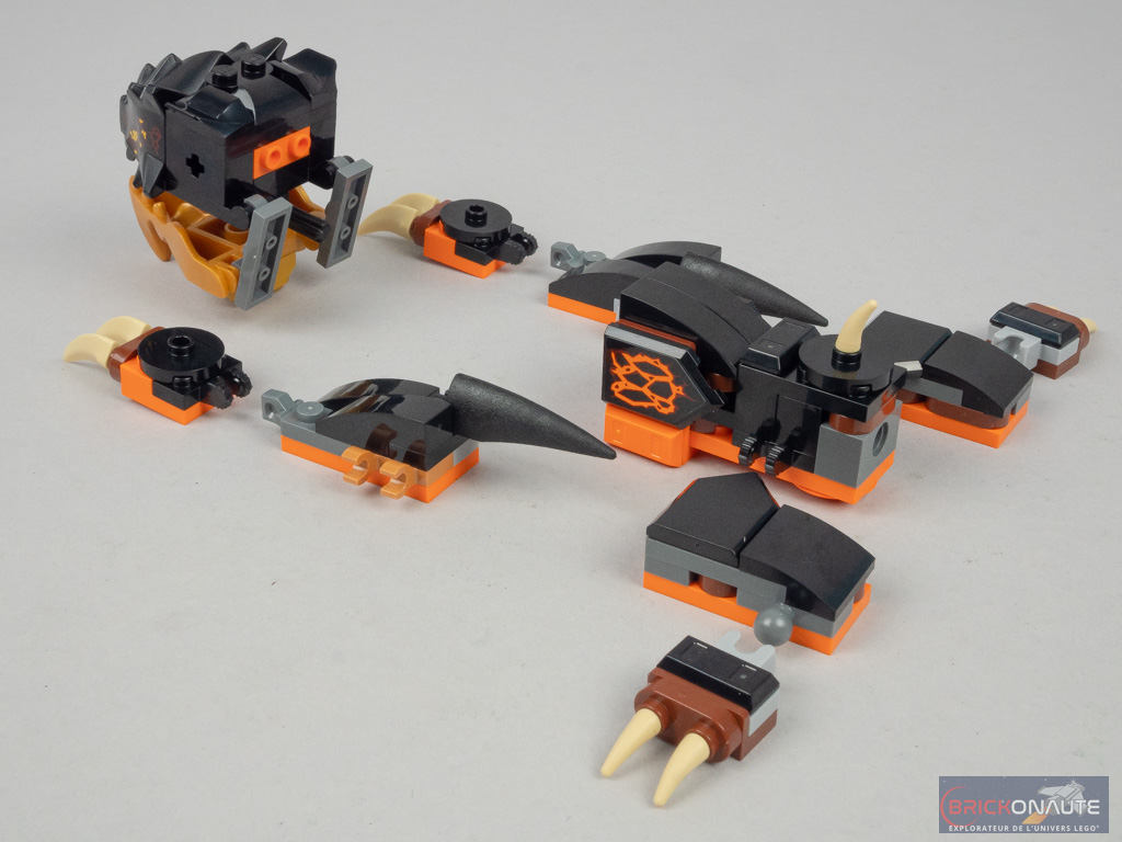 On construit ensuite, sur le même principe, la partie arrière du corps qui dispose de charnières sur lesquelles seront fixées les pattes. Elle est attachée à la partie avant du corps par deux pins. S’ensuit alors l’assemblage de 8 sous-ensembles qui formeront les pattes, qui seront fixés sur des ball joints ou des charnières suivant les cas. La construction de la tête est similaire à celle du dragon d’eau de Nya, la partie haute et la mâchoire étant reliées entre elles par des éléments disposant de 2 clips. C’est ainsi que s’achève le premier stade « d’évolution » de ce dragon.