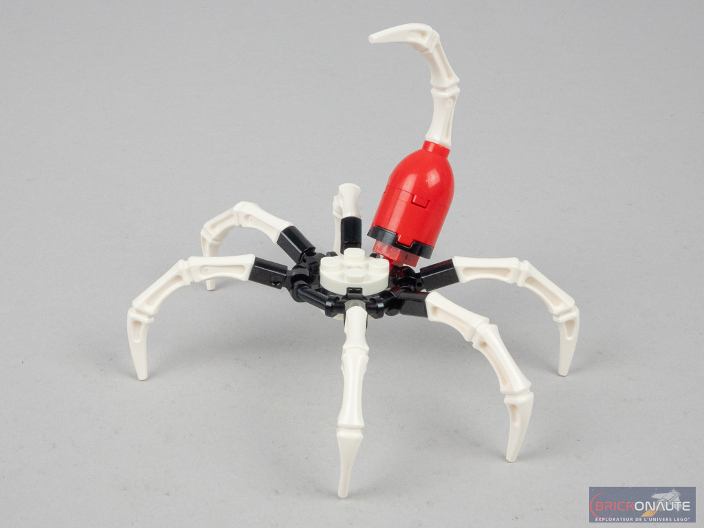 On s’occupe du deuxième stade avec le sachet de pièces portant le numéro 3. Qui commence par la construction d’un sous-ensemble qui vient s’insérer au milieu du corps pour « rallonger » le dragon. On lui ajoute également une queue avec deux pointes. Cette queue est fixée sur un pin Technic, elle peut donc tourner sur elle-même. On termine cette étape avec l’assemblage de la bestiole qui sert de monture au méchant de service – une sorte de scorpion.