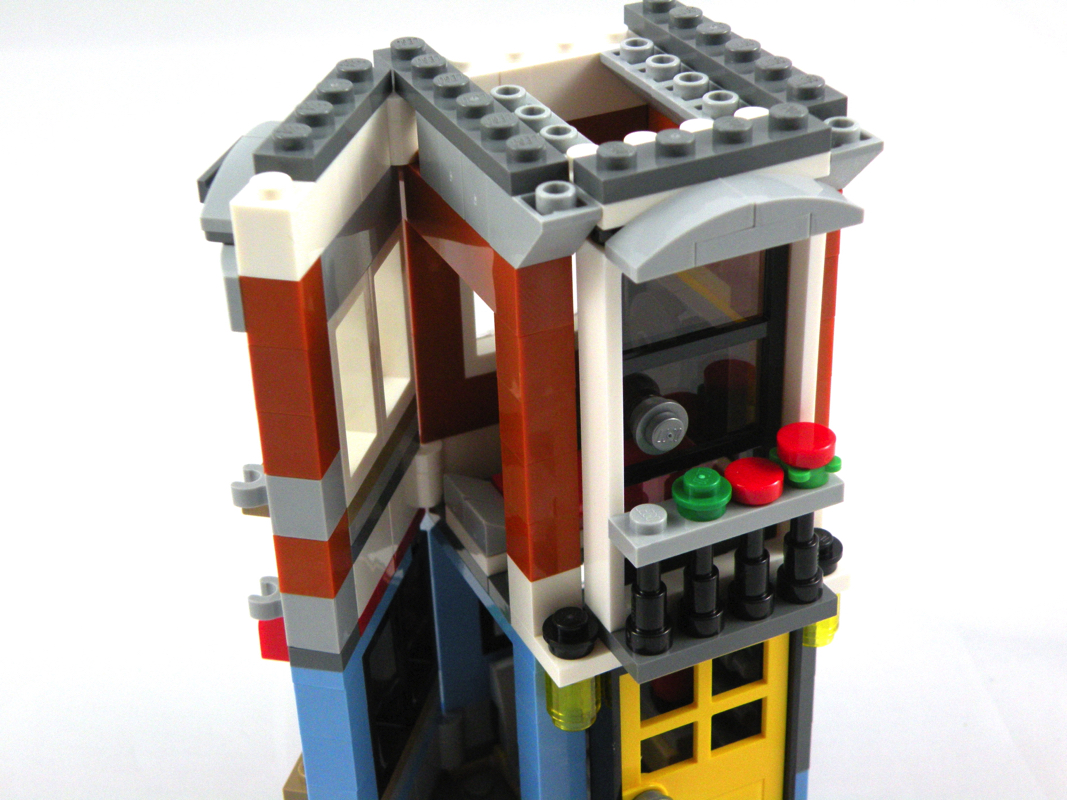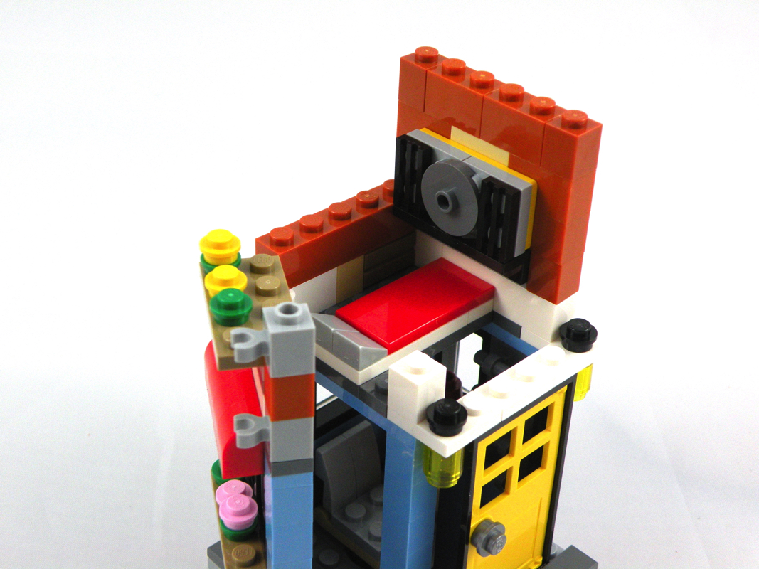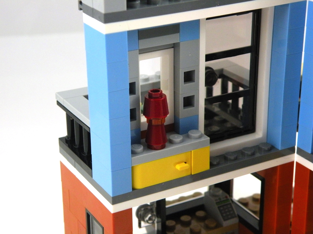 On continue avec l’assemblage du premier étage, cette fois en dark orange, les couleurs des étages sont donc inversées par rapport au coin « Deli ». On ajoute un lit, et une chose non identifiée au mur (une chaîne hi-fi ? peut-être…). Encore quelques fleurs sur le rebord de fenêtre, celles-ci étant au demeurant bien travaillées. Une porte mène sur un balcon, sur lequel on ne peut mettre une minifig qu’en gardant la porte ouverte.