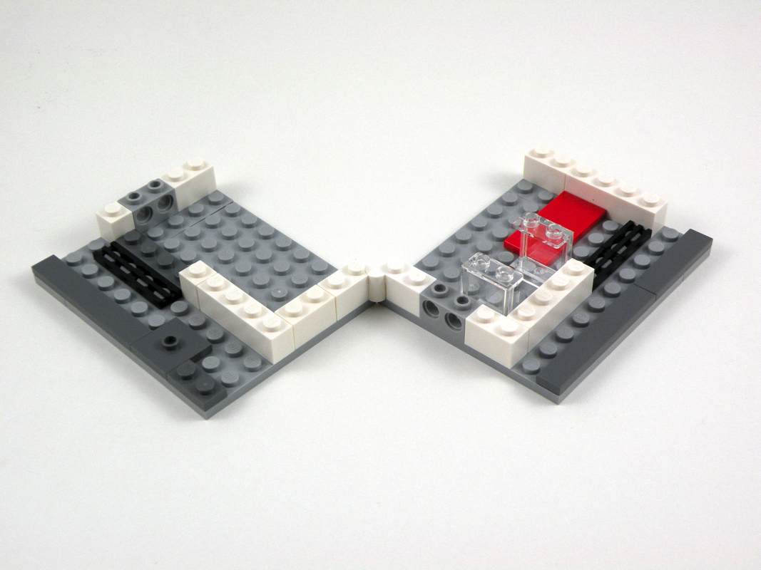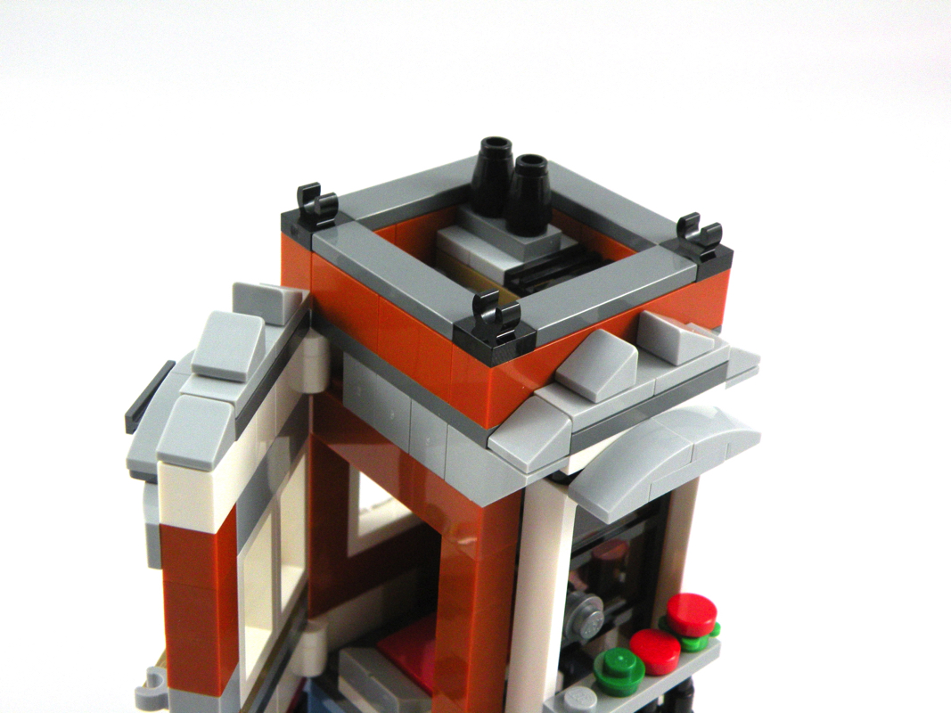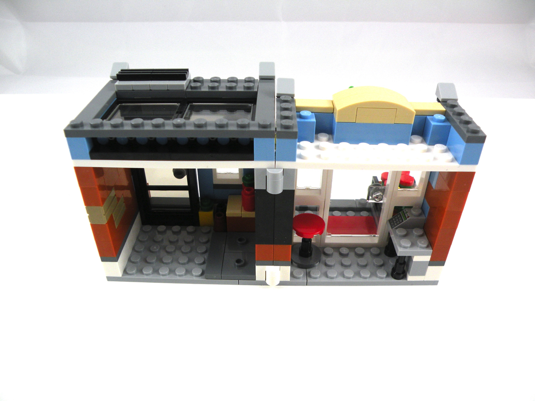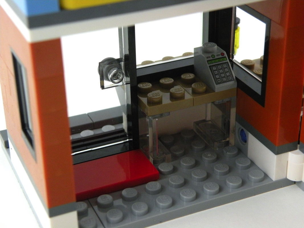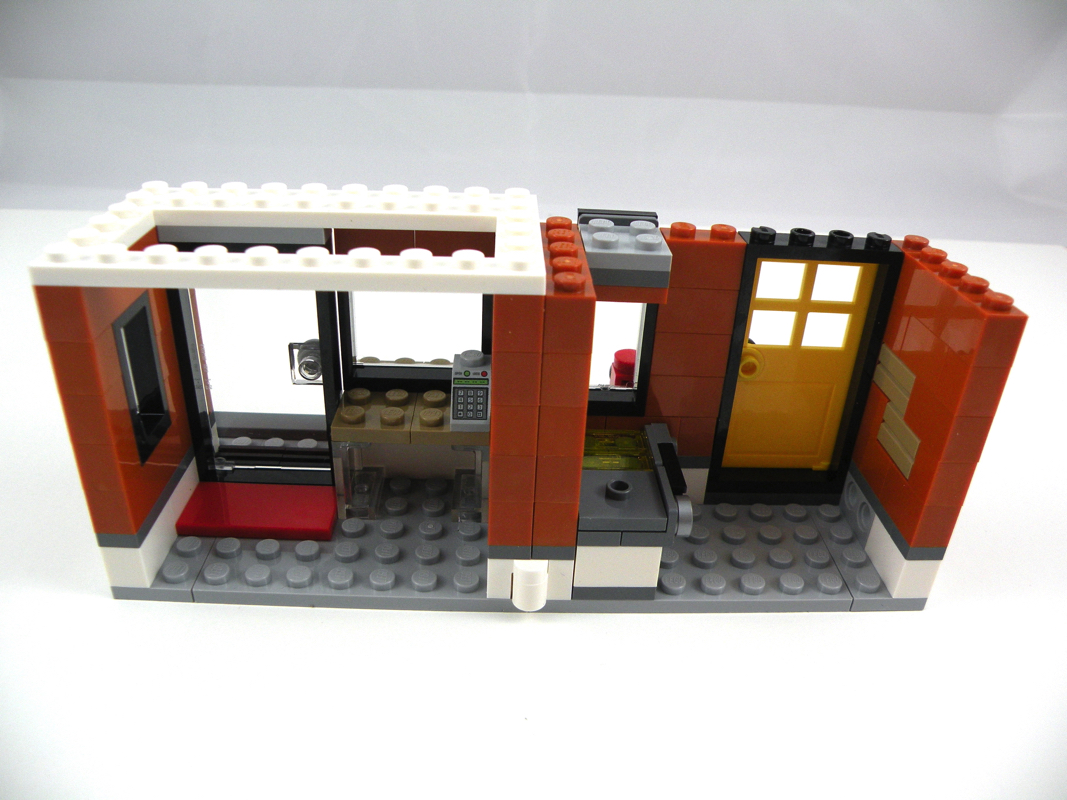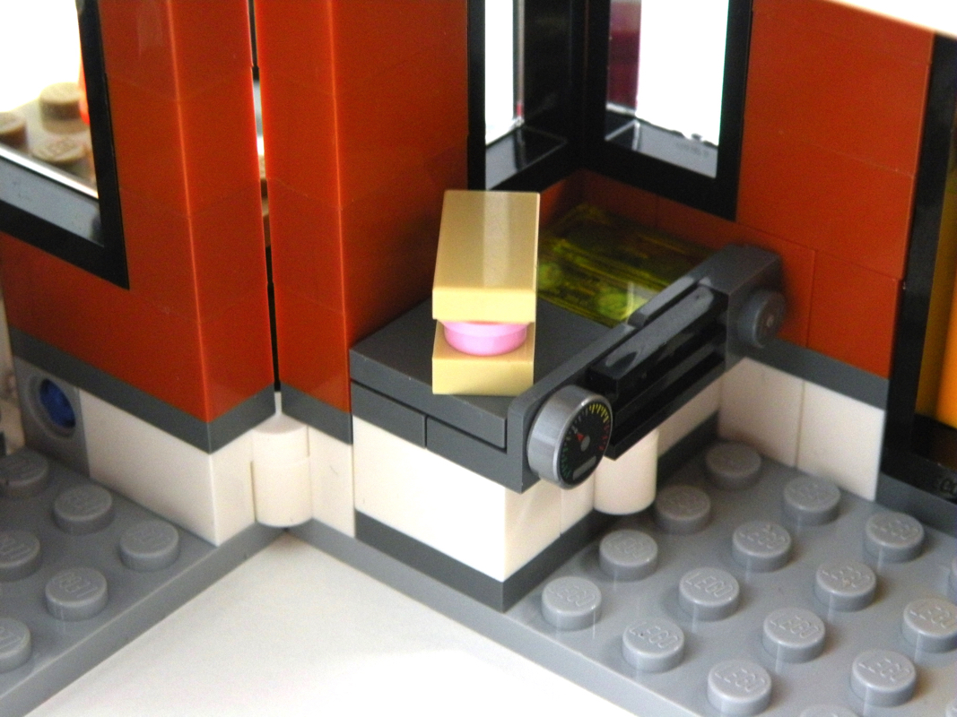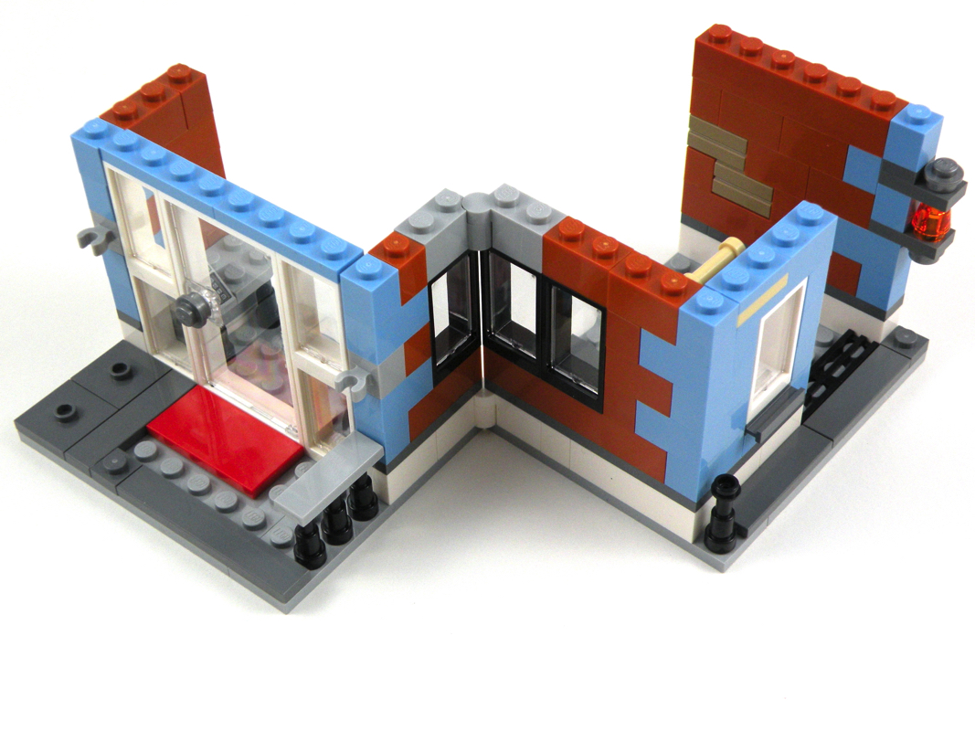 Le bâtiment est découpé en deux moitiés distinctes, reliées par une charnière. On commence par assembler les plaques de base en light bluish gray avant de monter les murs de cette partie basse en dark orange, les fenêtres et les comptoirs, la plaque de cuisson(très bien réalisée) ou encore la caisse.