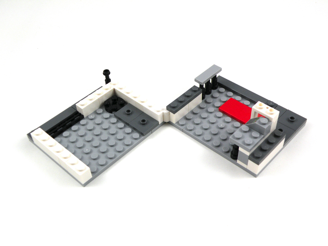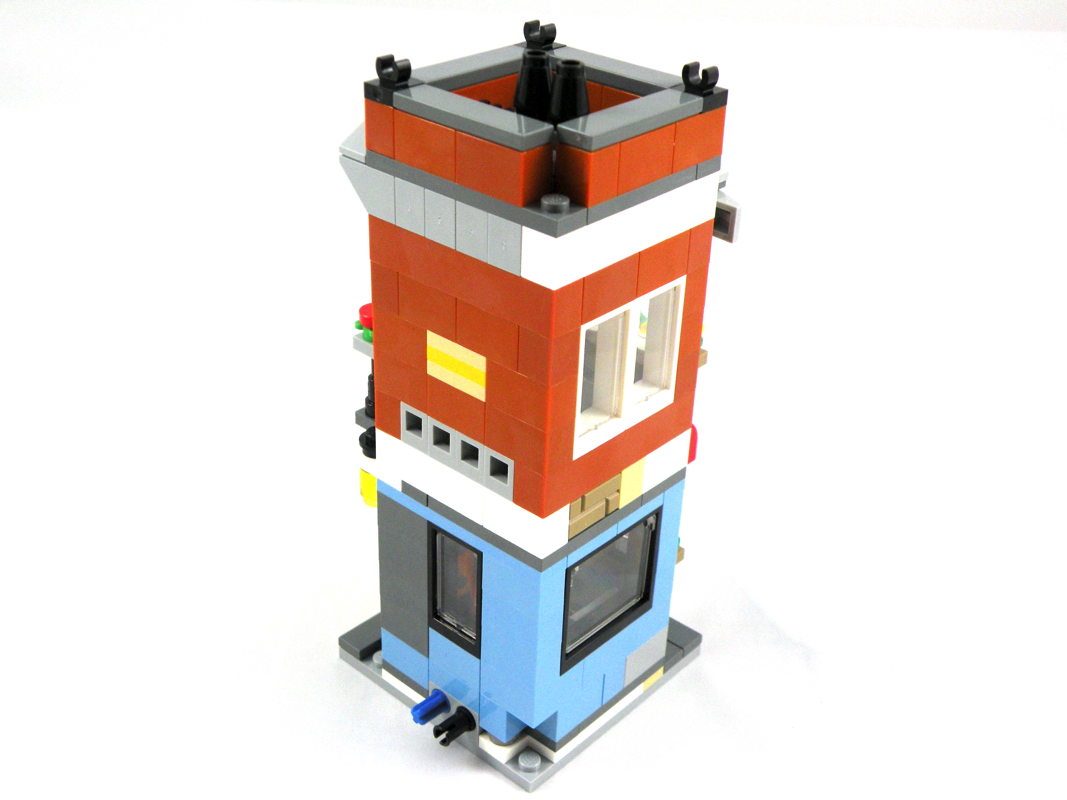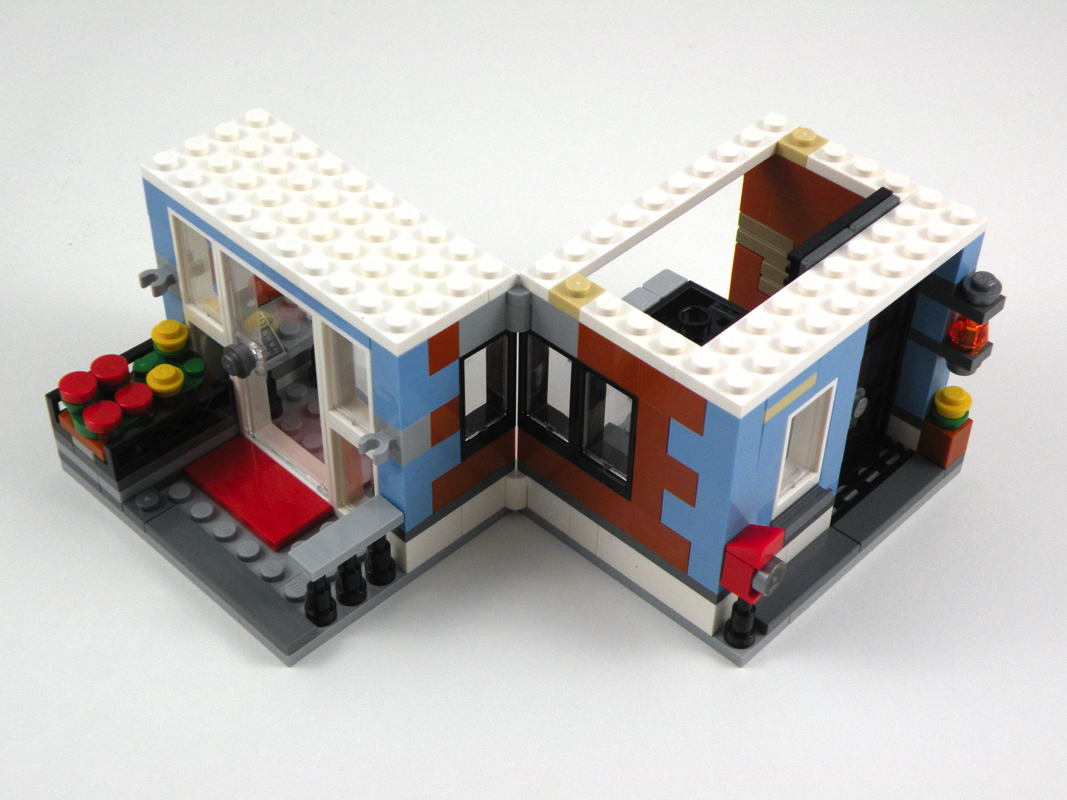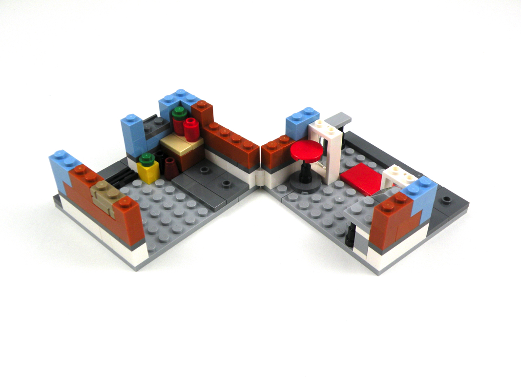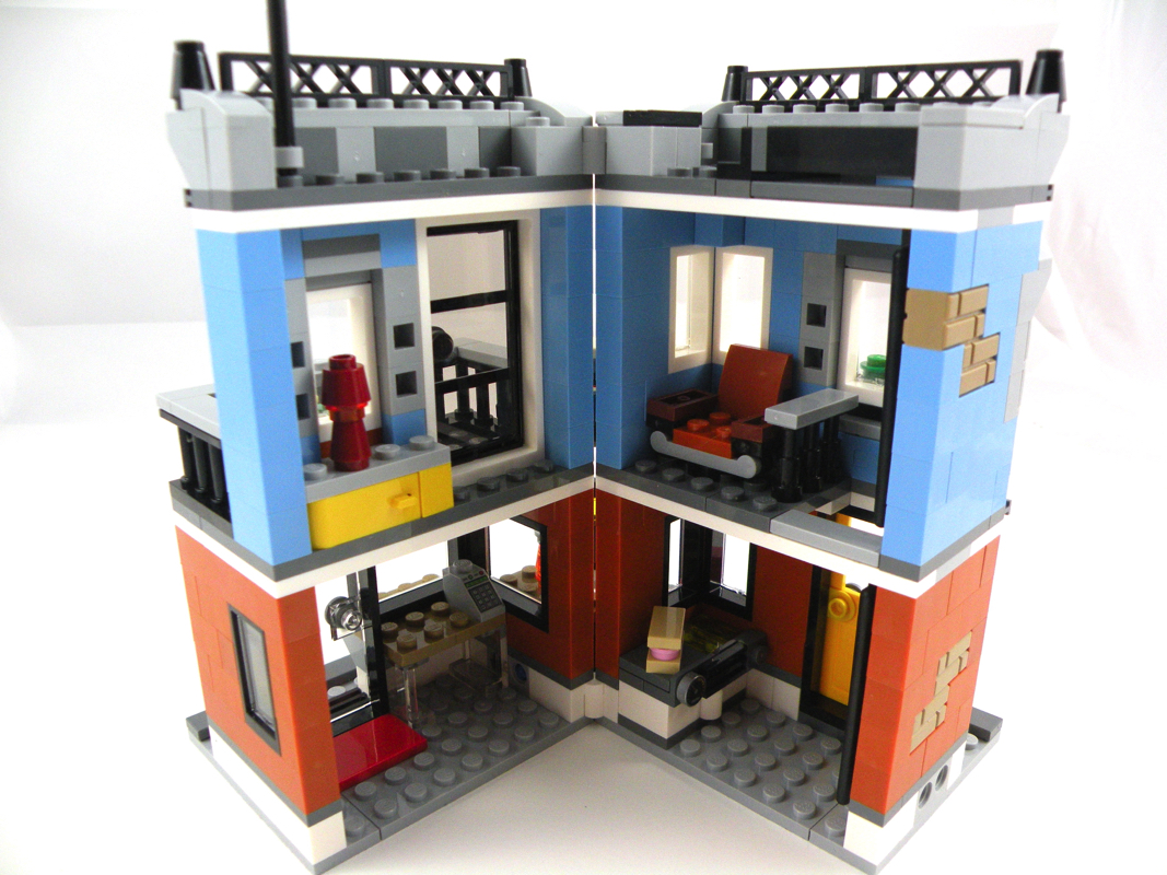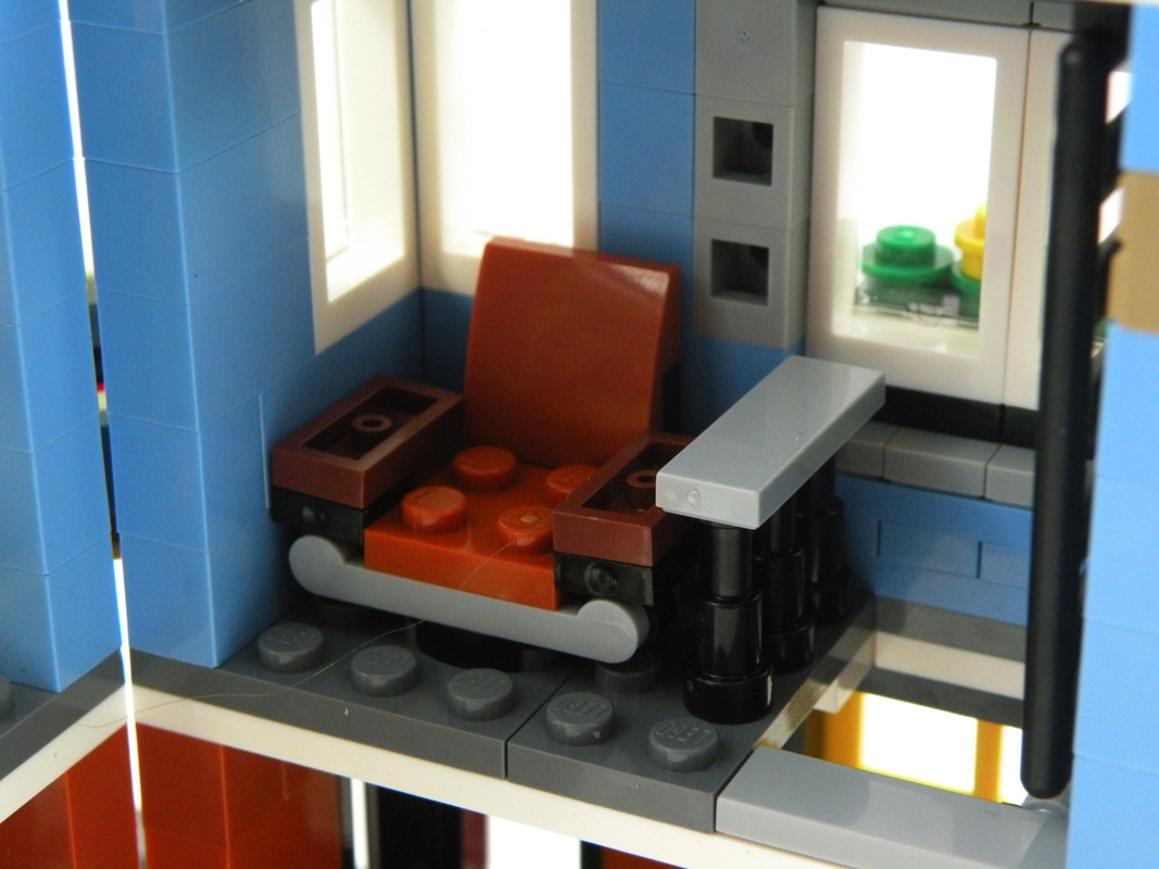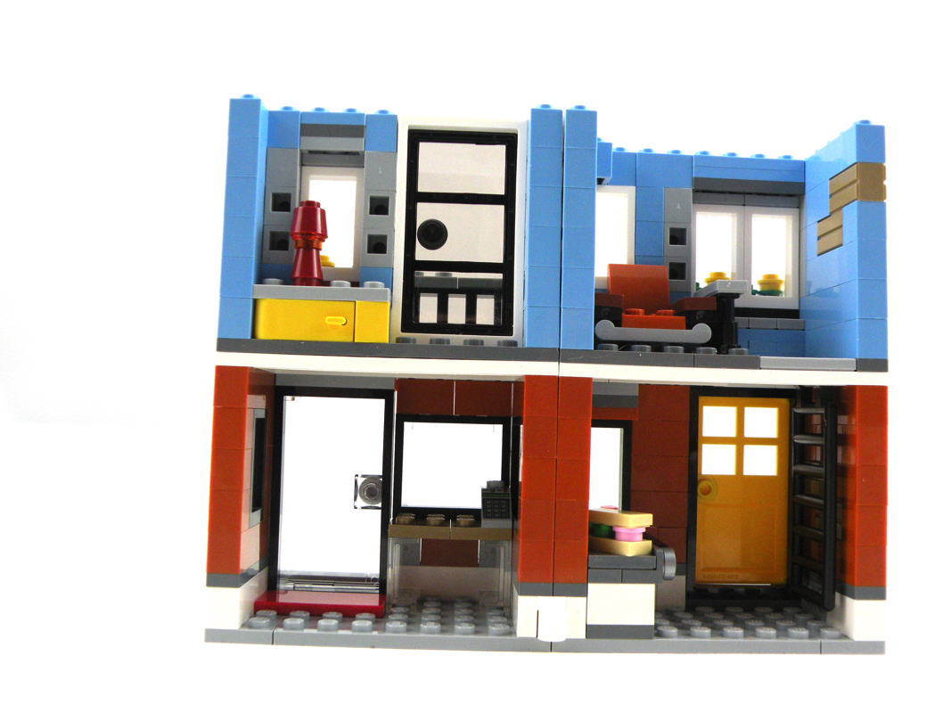 Une seule plaque de base est utilisée ici pour la construction. On note la présence de pins technic, qui permettent à terme d’ajouter la maison sur le coin « Deli » si on en possède plusieurs boîtes. Les murs du rez-de-chaussée sont en medium blue, on y retrouve quelques fleurs sur le bord de la fenêtre, un meuble avec une lampe, et un fauteuil. Cette fois-ci, c’est toute une façade articulée qui permet d’accéder à l’intérieur du bâtiment construit. Une échelle mène au premier étage (de toute manière, difficile de caser un escalier dans un si petit espace).