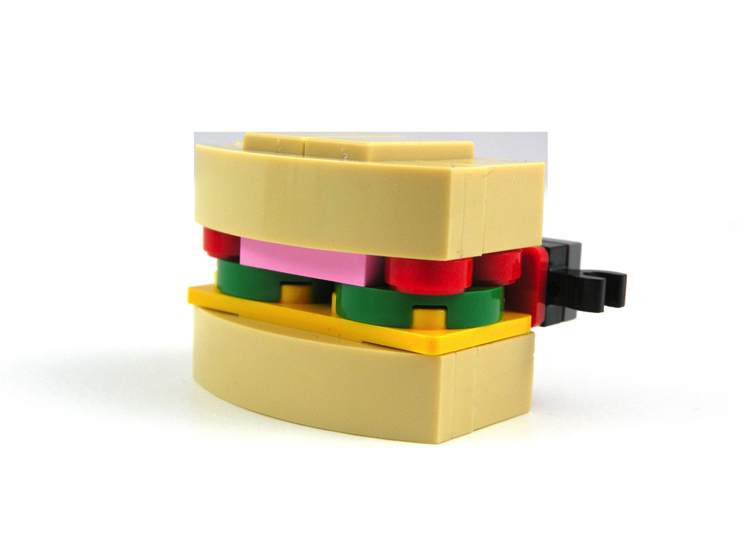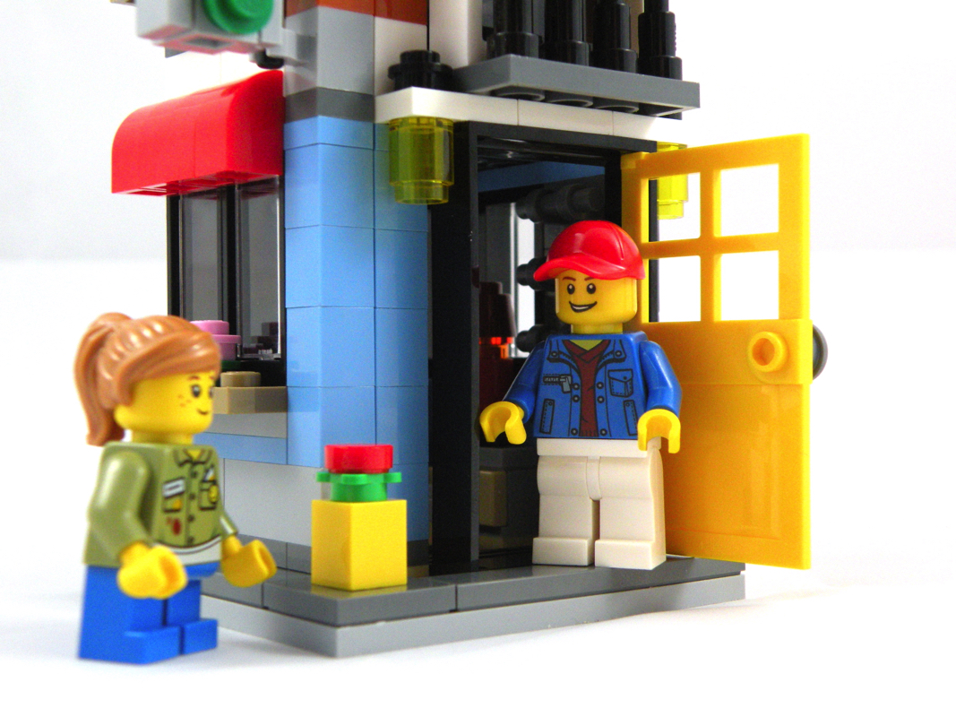 Dans cette première version, nous avons droit à une petite fille habillée en bleu, manifestement en jean, sur des petites jambes non articulées. La seconde minifig est l’employé du comptoir, avec sa veste en olive green, son petit smiley et le badge portant son nom, le tout sur des jambes blanches monochromes. Point positif, les têtes sont joliment travaillées et changent des têtes « génériques » qu’on retrouve notamment dans les bâtiments modulaires. Un petit sourire pour le serveur sous sa casquette, et des tâches de rousseur pour la jeune fille avec sa natte. L’accessoire de la jeune fille est un sandwich qu’elle vient manifestement d’acquérir au comptoir. A en juger par sa taille, elle mettra vraisemblablement plusieurs jours à le manger… Point négatif ici, si on souhaite faire tenir la fillette debout sans la fixer sur des tenons, il faudra soit lui ôter son sandwich, soit positionner celui-ci très près de son visage.