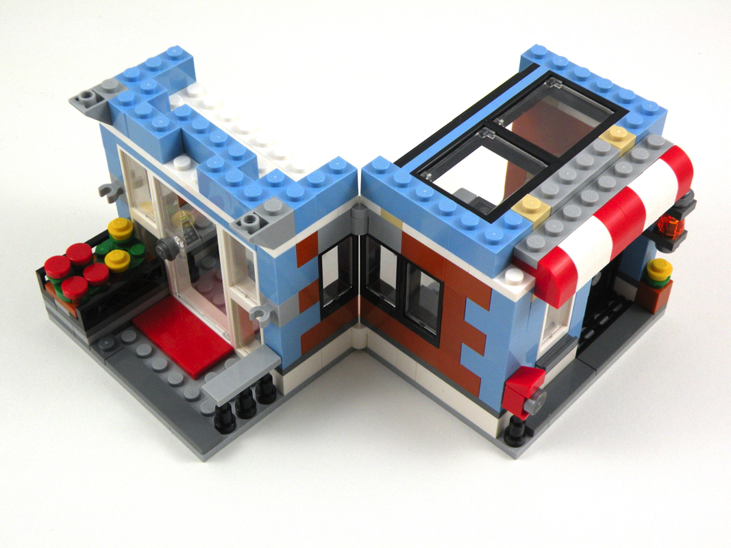 Comme expliqué plus haut, le modèle peut prendre trois configurations distinctes. La version « Corner » avec la terrasse dans le coin, la version « rue » avec la terrasse sur le côté, ou bien la version fermée pour reconstituer la boutique et l’appartement.