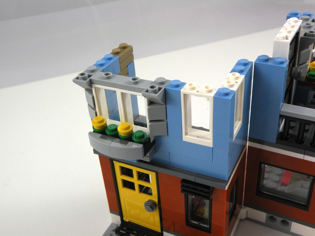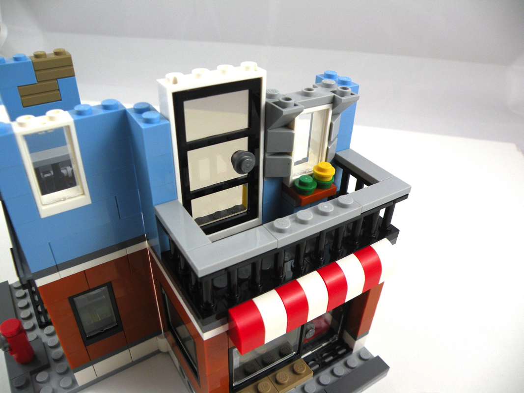 On continue avec l’assemblage du premier étage, cette fois en dark orange, les couleurs des étages sont donc inversées par rapport au coin « Deli ». On ajoute un lit, et une chose non identifiée au mur (une chaîne hi-fi ? peut-être…). Encore quelques fleurs sur le rebord de fenêtre, celles-ci étant au demeurant bien travaillées. Une porte mène sur un balcon, sur lequel on ne peut mettre une minifig qu’en gardant la porte ouverte.