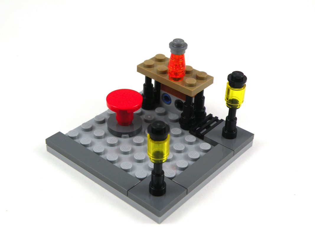 Le bâtiment est découpé en deux moitiés distinctes, reliées par une charnière. On commence par assembler les plaques de base en light bluish gray avant de monter les murs de cette partie basse en dark orange, les fenêtres et les comptoirs, la plaque de cuisson(très bien réalisée) ou encore la caisse.