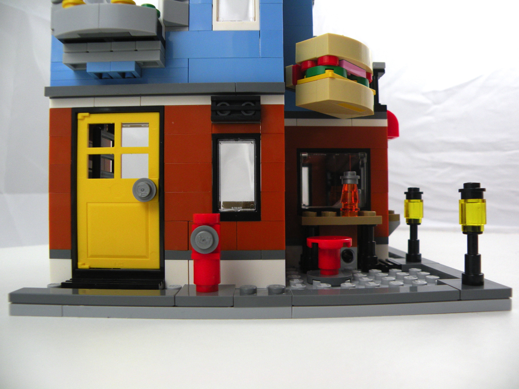 Une seule plaque de base est utilisée ici pour la construction. On note la présence de pins technic, qui permettent à terme d’ajouter la maison sur le coin « Deli » si on en possède plusieurs boîtes. Les murs du rez-de-chaussée sont en medium blue, on y retrouve quelques fleurs sur le bord de la fenêtre, un meuble avec une lampe, et un fauteuil. Cette fois-ci, c’est toute une façade articulée qui permet d’accéder à l’intérieur du bâtiment construit. Une échelle mène au premier étage (de toute manière, difficile de caser un escalier dans un si petit espace).