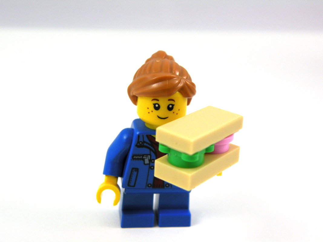 Dans cette première version, nous avons droit à une petite fille habillée en bleu, manifestement en jean, sur des petites jambes non articulées. La seconde minifig est l’employé du comptoir, avec sa veste en olive green, son petit smiley et le badge portant son nom, le tout sur des jambes blanches monochromes. Point positif, les têtes sont joliment travaillées et changent des têtes « génériques » qu’on retrouve notamment dans les bâtiments modulaires. Un petit sourire pour le serveur sous sa casquette, et des tâches de rousseur pour la jeune fille avec sa natte. L’accessoire de la jeune fille est un sandwich qu’elle vient manifestement d’acquérir au comptoir. A en juger par sa taille, elle mettra vraisemblablement plusieurs jours à le manger… Point négatif ici, si on souhaite faire tenir la fillette debout sans la fixer sur des tenons, il faudra soit lui ôter son sandwich, soit positionner celui-ci très près de son visage.