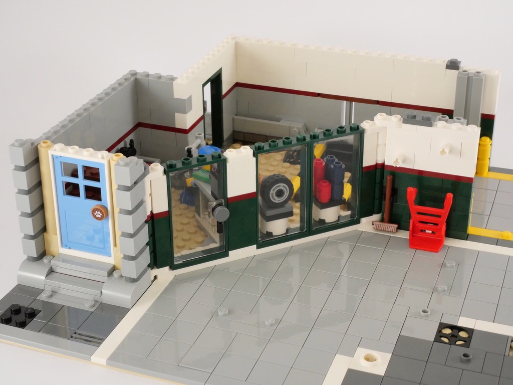 Nous continuons alors à élever les murs, puis nous construisons un sous-ensemble constituant la vitrine du garage. Celle-ci est inclinée de 45° avec le reste de la construction. On ajoute quelques objets en vitrine, puis la porte qui mène au cabinet du vétérinaire situé à l’étage. Une petite round tile tampographiée avec une trace de patte est disposée en guise de poignée.