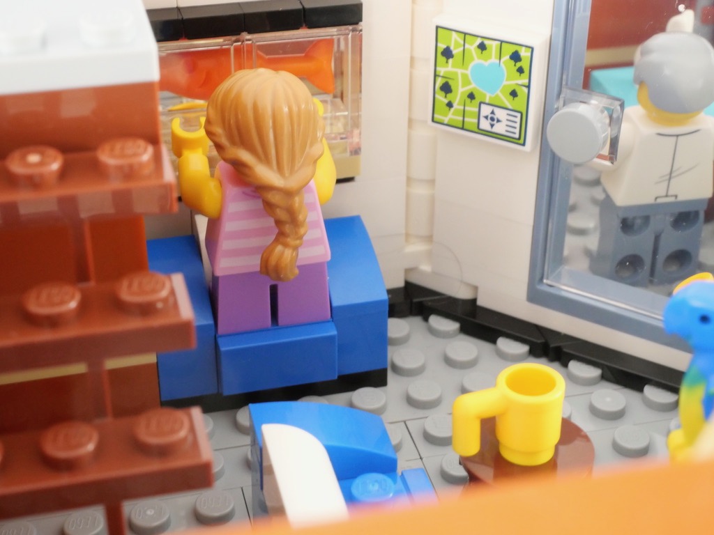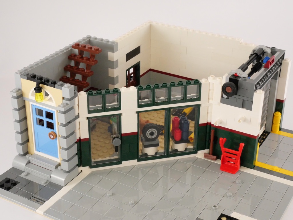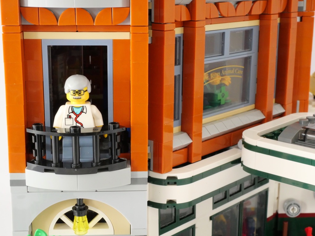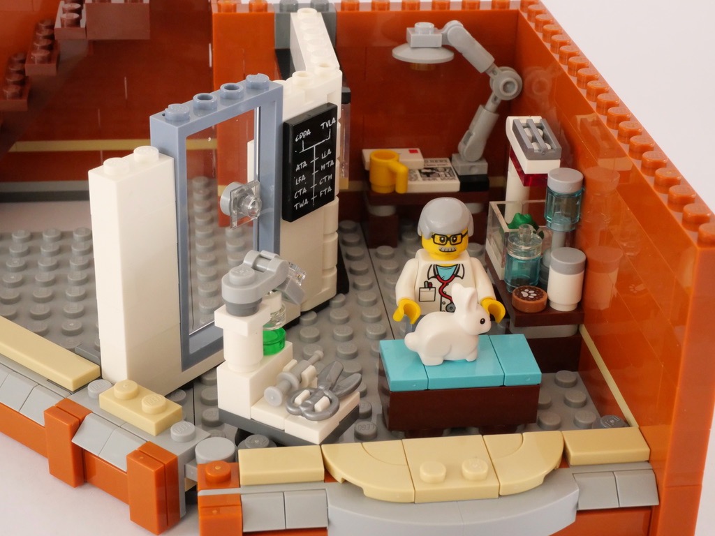 Commençons par l’essentiel, qui constitue pour la majorité des acheteurs de ce set le point le plus important : l’expérience de construction. Elle est une nouvelle fois au rendez-vous, avec de nombreuses techniques intéressantes à mentionner. On remarquera particulièrement la manière de réaliser cet façade orientée à 45°, ou les différentes fenêtres des étages supérieurs. On appréciera également les nombreux petits aménagements intérieurs, qu’il s’agisse des outils du garage, de l’équipement du vétérinaire ou de l’aménagement intérieur de l’appartement au deuxième étage.