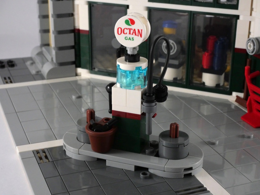 Nous commençons les sachets portant le numéro 3 avec la construction de la pompe à essence. Le sens du détail va ici jusqu’à intégrer une raclette et un seau au pied de la pompe.