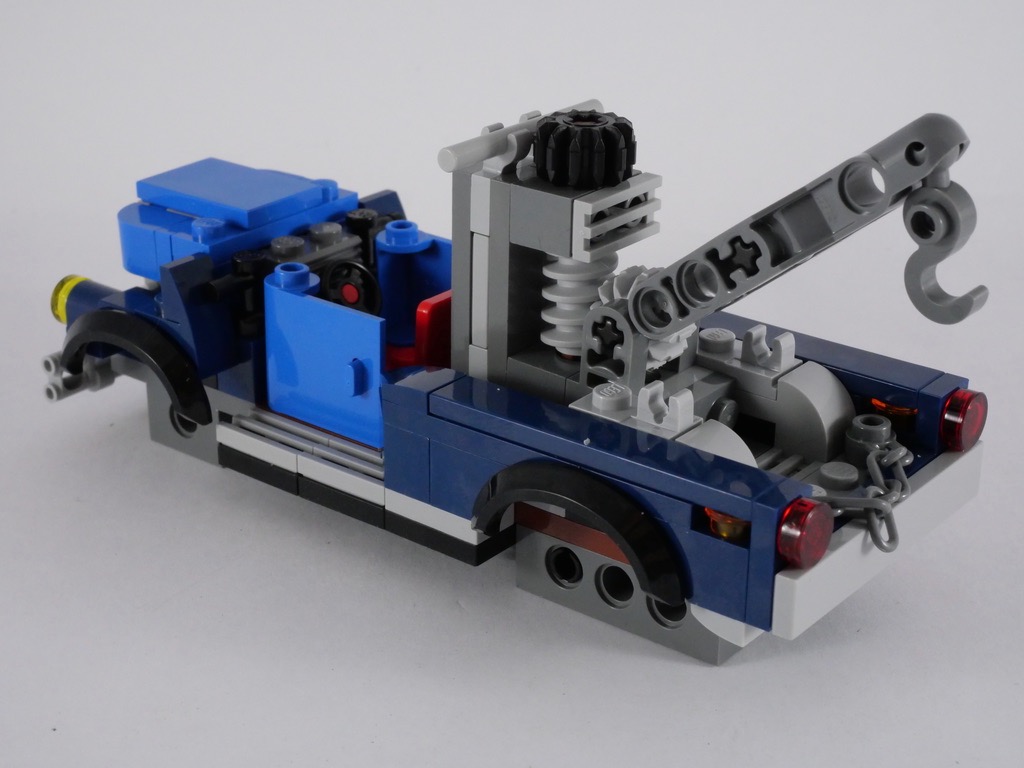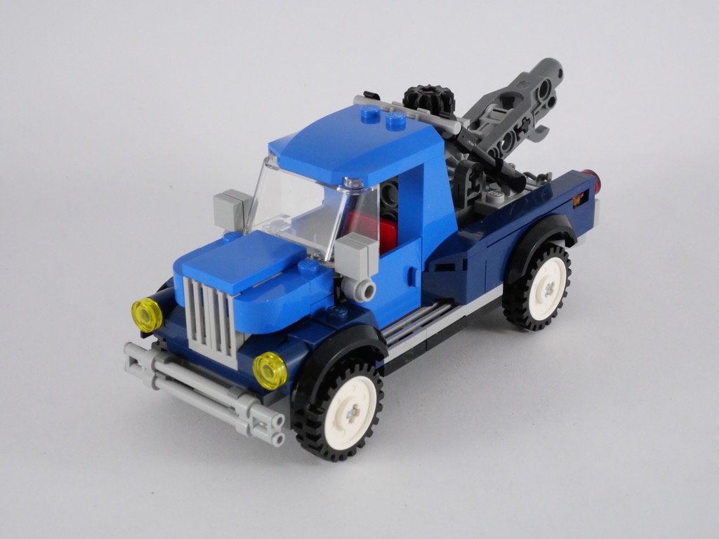Nous construisons alors la dépanneuse, d’une largeur de 6 tenons. Après avoir assemblé le châssis, on ajoute les passages de roues puis on aménage le poste de conduite. On continue avec la carrosserie, puis la grue. Celle-ci est actionnée grâce à une molette en partie supérieure qui entraîne une vis sans fin. Nous terminons cette dépanneuse avec le pare-brise, le toit, les rétroviseurs et les roues.