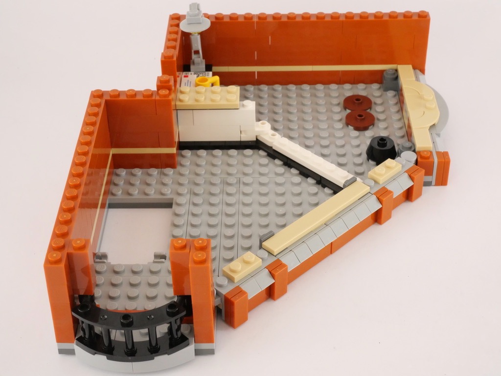 Nous nous occupons alors de la corniche située sur la face avant, joliment travaillée à l’aide de brackets décorés de petites tiles couleur dark orange. Au dessus de celles-ci, nous ajoutons également une rangée de pièces « pointues » (Roof Tile 1X1, Deg. 45, W/O Knobs) comme pour le premier et le deuxième étage. Attention à bien aligner tous ces petits éléments pour obtenir quelque chose de joli. Quelques slopes et pièces arrondies viennent fignoler tout cela.