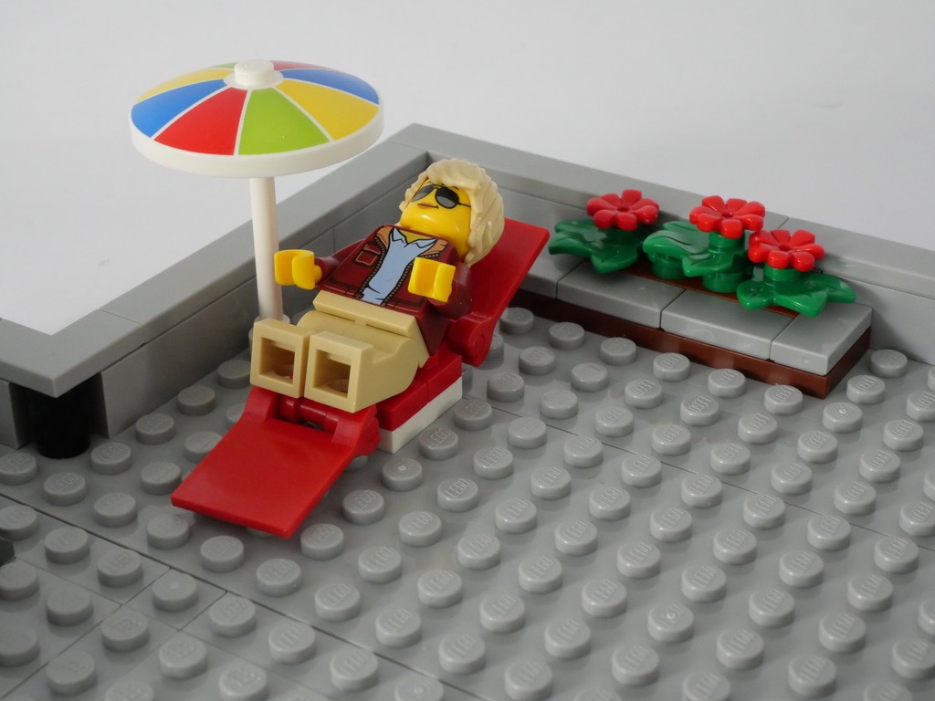 Il ne reste qu’à ajouter une chaise longue et un parasol, et à poser cette toiture sur notre garage pour terminer celui-ci.