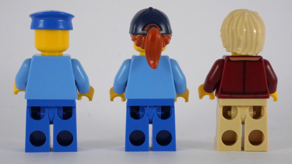 La tenue des garagistes est identique : un pantalon monochrome et un haut de salopette bleu tampographié uniquement côté torse. Le garagiste (qui doit s’appeler Jo, à en juger par le nom du garage) porte une casquette dans le style des anciens policiers ou chefs de gare et arbore une barbe grisonnante. La mécanicienne a quelques tâches de cambouis sur le visage, et porte une casquette de laquelle dépasse une queue de cheval. La conductrice de scooter porte pour sa part une veste rouge au dessus d’un polo bleu, le dos étant tampographié de quelques coutures. Elle porte des lunettes de soleil sous sa chevelure blonde ou son casque, LEGO nous offrant ici le choix.