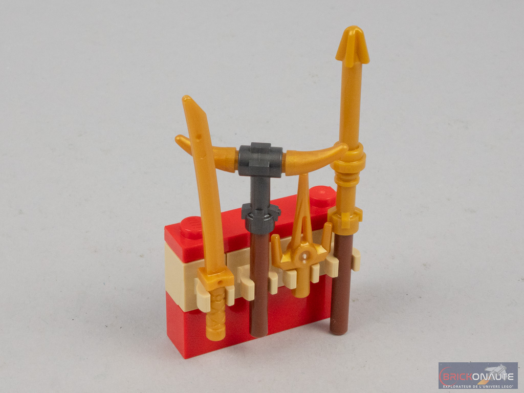 Deux apprentis sont présents au dojo pour s’entraîner. Ils portent le même pantalon que le Wu-Bot vu dans plusieurs références, mais leur torse est inédit et, à l’heure actuelle, exclusif à ce set. La réalisation est simple mais propre. Le dernier protagoniste est les méchant de service, un chasseur squelette, qui reprend les éléments vus dans les autres sets sortis début 2023. On regrettera toujours, je me répète, la tampographie un peu terne des couleurs claires sur le torse noir.