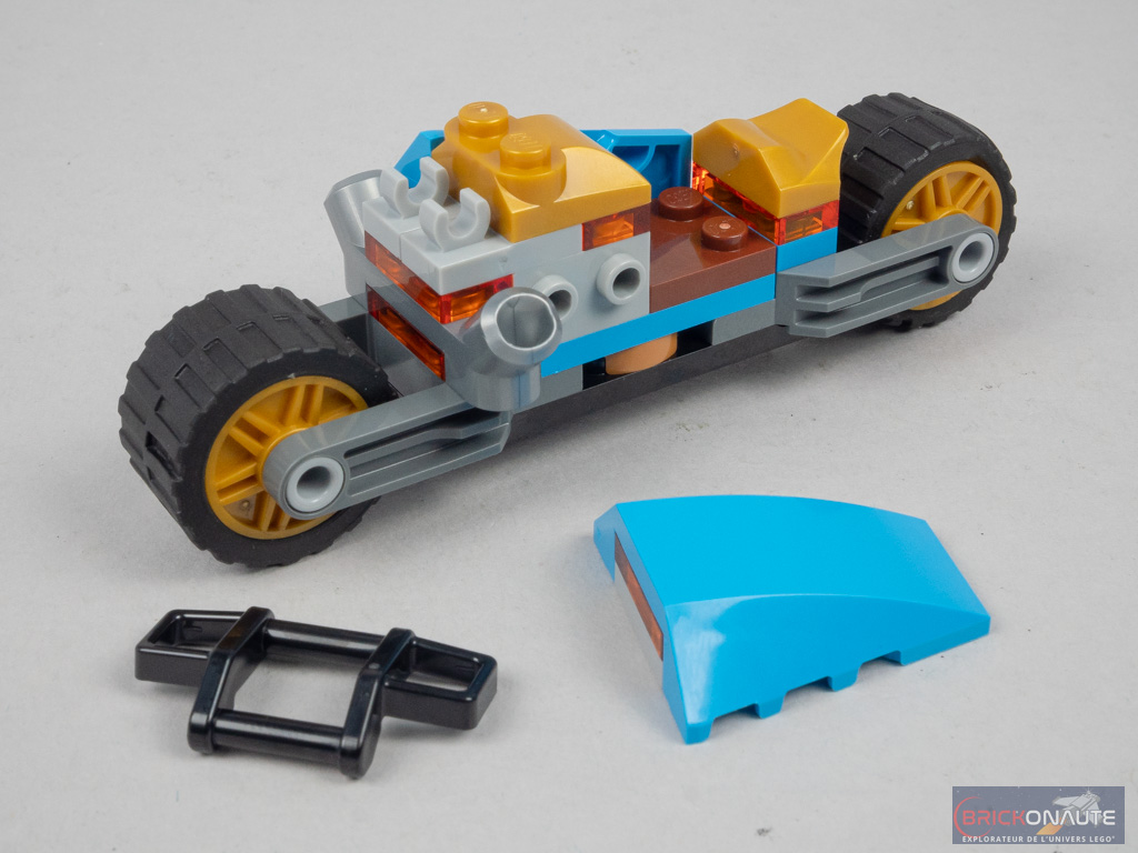 On continue avec un petit rack à outils et ses deux outils clipsés, et la moto de Nya qui propose l’utilisation d’éléments Technic pour la fixation des roues, des clips pour le guidon, et quelques éléments SNOT pour la carrosserie.
