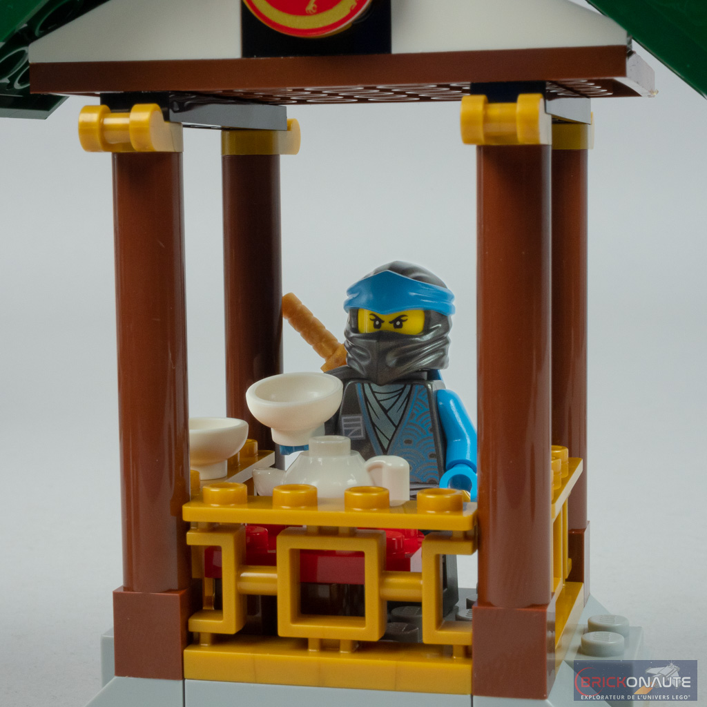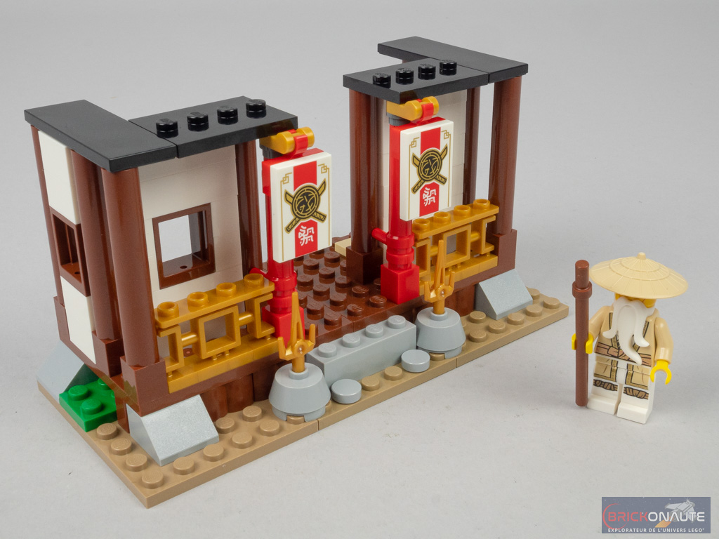 Commençons par le design de l’ensemble. Malgré des « petites » constructions de quelques dizaines de pièces tout au plus, l’aspect est soigné et les éléments sont cohérents. Les formes, des toits notamment, et le mélange de couleurs marron, vert, blanc et doré correspond bien à ce qu’on attendrait d’un dojo d’entraînement de ninjas. Alors évidemment, pas de fioritures ici mais c’est tout à fait satisfaisant.