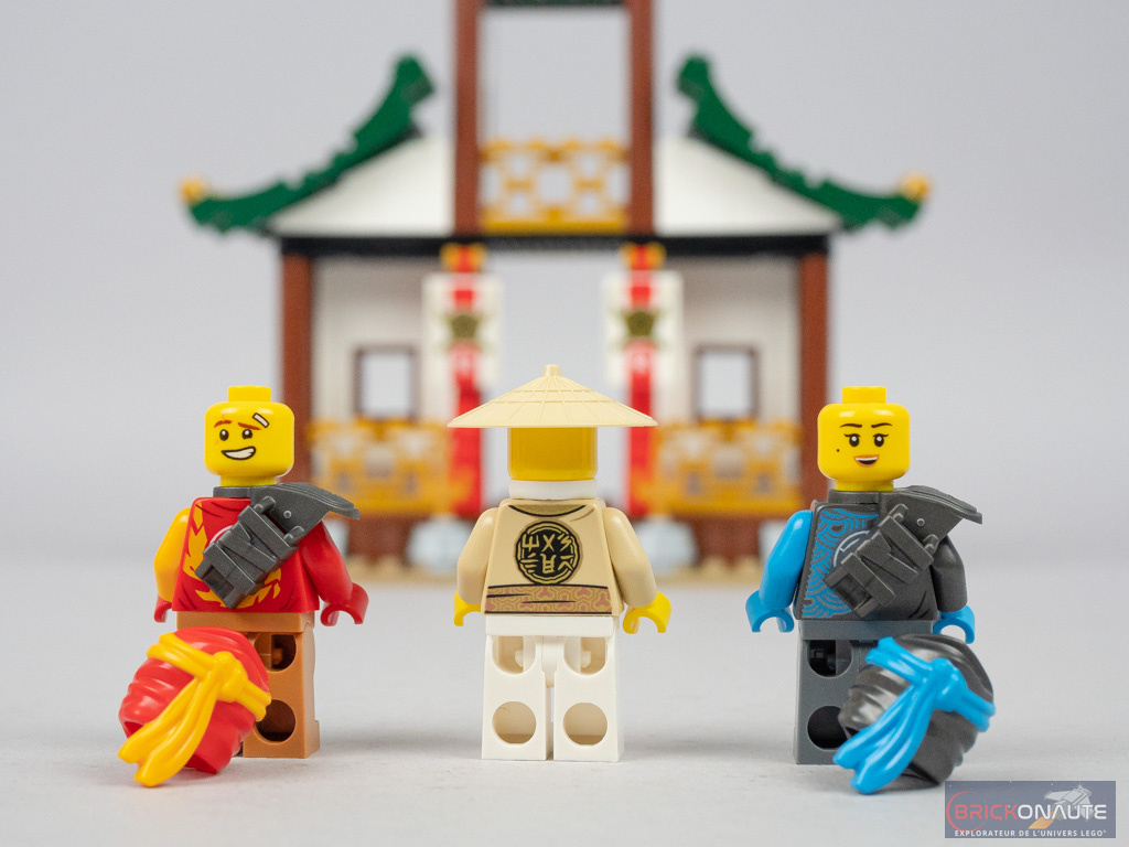 Du côté des minifigs, on appréciera la présence de Maître Wu – c’est seulement le deuxième set où on le trouve dans cette tenue. Et le torse des deux apprentis ninjas est exclusif à cette boîte, du moins pour le moment. On remarquera, comme pour les autres sets de cette gamme, une réalisation soignée de l’ensemble des protagonistes. Avec 6 personnages au compteur (mais un seul « méchant »), les mises en scènes possibles seront nombreuses et la jouabilité au rendez-vous.