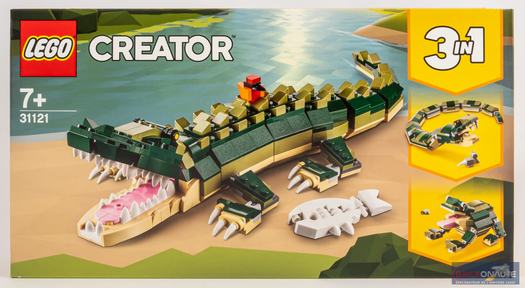 La boîte reprend le schéma habituel des sets de la gamme LEGO Creator : le modèle principal, ici le crocodile, occupe la majeure partie de l’espace. Un petit encart sur le côté droit nous montre les deux autres modèles prévus : un serpent et une grenouille. Nous découvrons au dos 3 autres images de ces animaux.