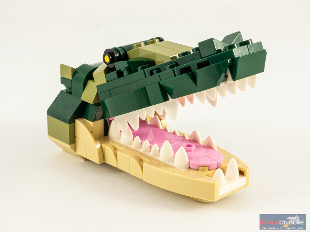 La gamme LEGO Creator est l’occasion pour LEGO de nous proposer des animaux brick-built et avec ce set, ce sont donc 3 nouvelles bestioles qui arrivent dans cette gamme. Et force est de constater que, malheureusement, ils sont très inégaux dans leur conception. Le modèle principal, le crocodile, est franchement bien fait. Les joints qui connectent les différentes parties du corps sont plutôt bien dissimulés, à l’exception des pattes et de l’extrémité de la queue, mais c’est finalement acceptable.