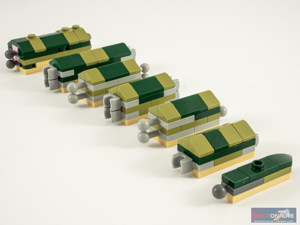 On commence la construction par deux petits assemblages : un oiseau, proie de notre crocodile, et un squelette de poisson. On attaque alors la construction du crocodile à proprement parler, et plus précisément sa queue. Les éléments qui la constituent sont semblables les uns aux autres, si ce n’est qu’à mesure qu’on s’éloigne de l’extrémité de la queue, la section augmente. Ils sont reliés entre eux par des ball joints, et on dispose quelques cheese slopes couleur olive green en guise d’écailles. Les plus petits segments sont plats, les plus gros sont basés sur des demi-coques de couleur tan.