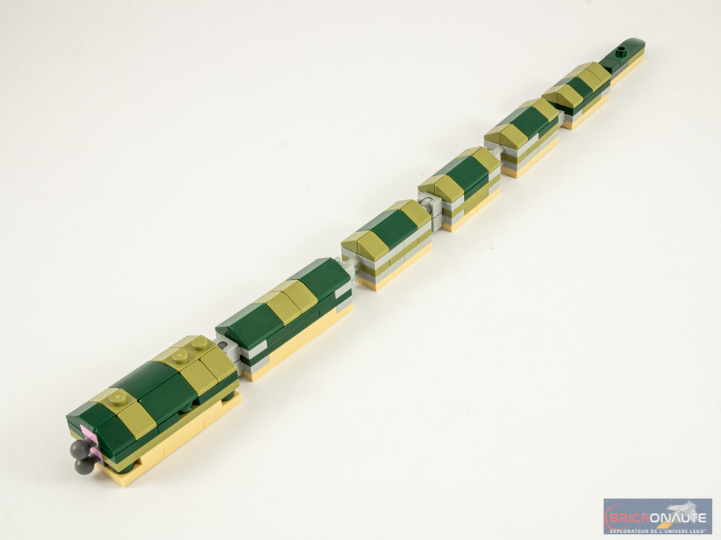 La conception du corps du serpent est identique à celle du crocodile : des pièces tan en base, couvertes de pièces vertes pour former les différents « modules » du corps, les modules étant reliés entre eux par des ball joints. À une différence majeure près : la finesse du corps ne permet pas de masquer les côtés des connecteurs gris, visibles sur seulement deux modules du croco. Et la conception des modules / l’utilisation de joints longs autorise certes une liberté de mouvement plus grande, mais est vraiment trop visible. 7 modules, dont l’épaisseur augmente peu à peu, sont ainsi construits pour constituer le corps du serpent.