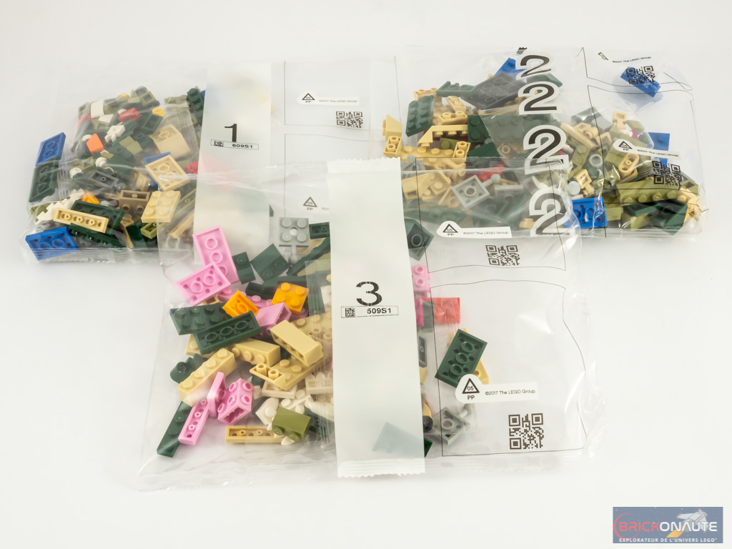 À l’intérieur, nous trouvons 3 sachets de pièces numérotés, et 3 notices d’instructions. Une lecture rapide de l’inventaire ne m’a pas permis de déceler d’éléments particulièrement rare, on notera cependant comme toujours la grande variété d’éléments proposés : 454 pièces, réparties en 101 références ! Tout ça pour un prix « contenu » : 29,99 €.
