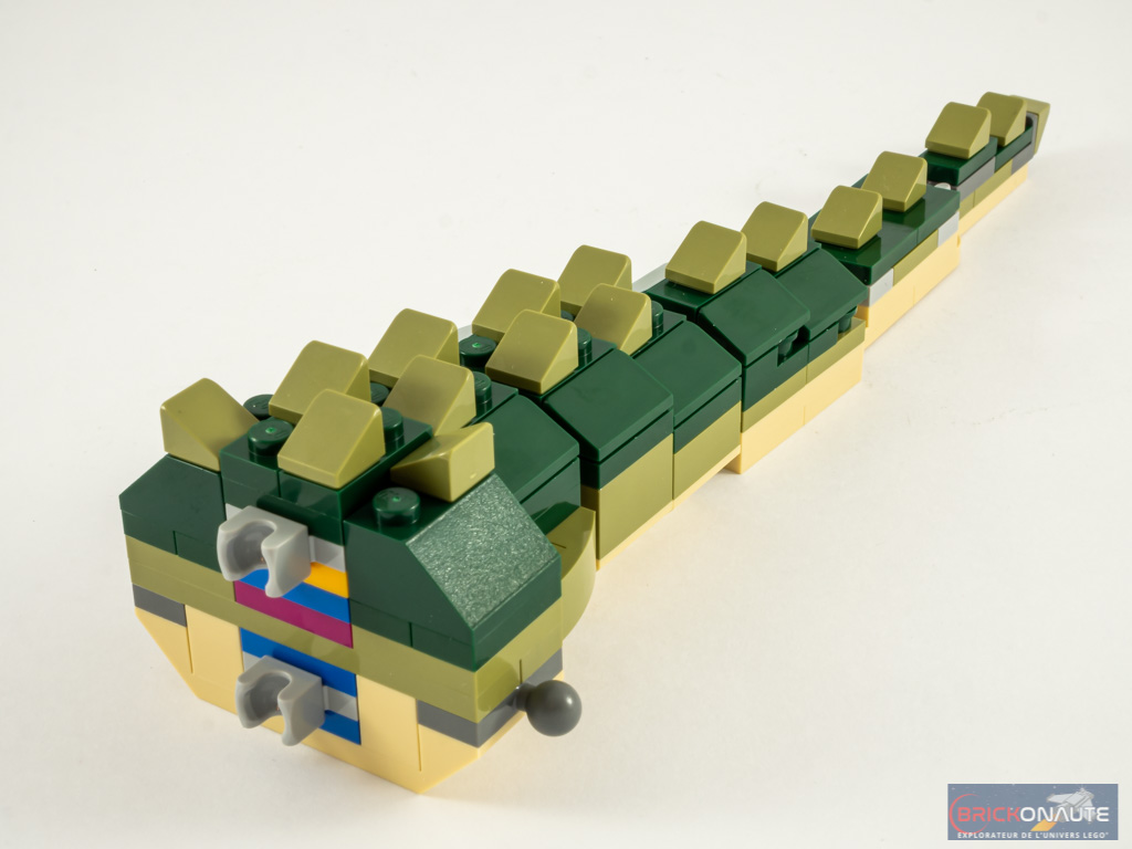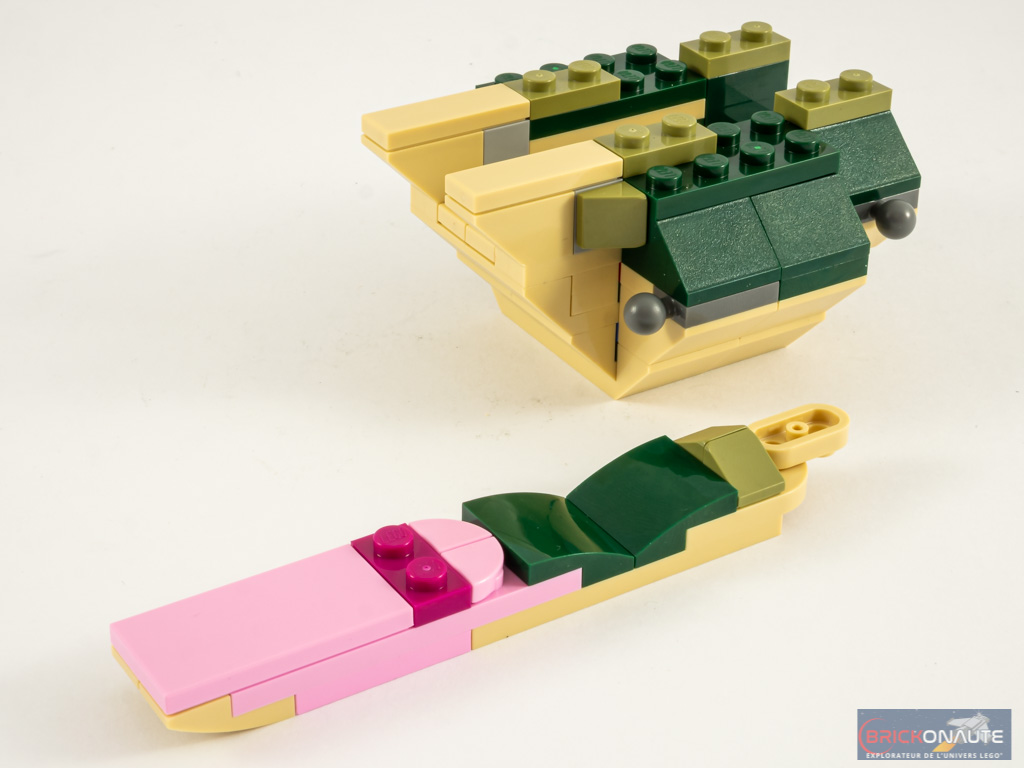 Ce set permet de faire un joli crocodile, je le trouve bien fait. Et ta photo avec la minifg donne une bonne idée de sa taille. La grenouille est aussi une jolie surprise avec peu de pièces utilisées !