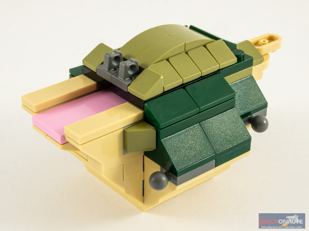 C’est le troisième et dernier animal à assembler, et malgré le fait qu’il n’utilise même pas la moitié de l’inventaire, la construction est relativement intéressante. Le corps est constitué d’une superposition de demi-coques, dans un sens pour le ventre, puis dans l’autre pour le cou. On dispose des pièces lisses à l’intérieur, puis on continue l’assemblage pour former un « rail ». Rail dans lequel vient s’insérer un petit sous-assemblage essentiellement rose constituant la langue, qu’il sera possible de sortir en poussant la queue. C’est malin, et bien réalisé.