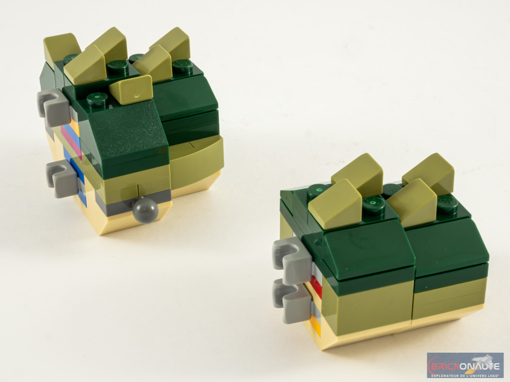 On remarquera quand même que LEGO s’obstine à ne proposer que des joints gris, qui nuisent à l’esthétique globale. Joints gris qui sont nettement trop visibles sur le serpent. Certes, le fait de les écarter davantage offre une possibilité de mouvement plus ample… mais ils sont vraiment trop exposés. La seule partie réellement intéressante dans le serpent est sa tête et les deux éléments qui la précèdent : les articulations prévues permettent à l’animal de lever la tête pour lui offrir une position plus dynamique.