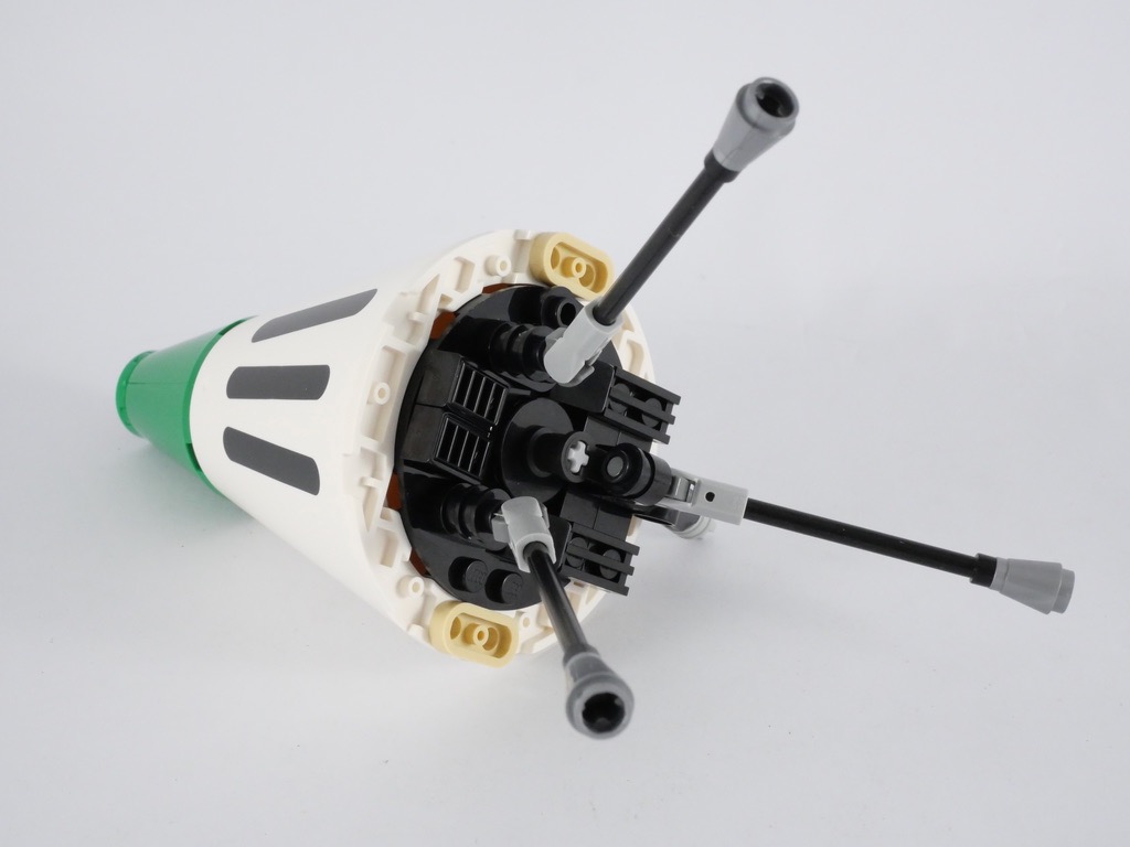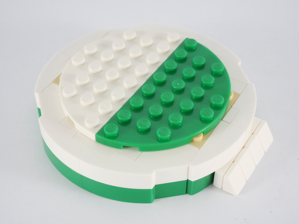 Nous construisons alors deux sous-ensembles qui prennent place de part et d’autre du corps. Ils sont verts dans leur moitié inférieure, et blancs en haut. On décore ensuite ces éléments de quelques greebles avant de les fixer.
