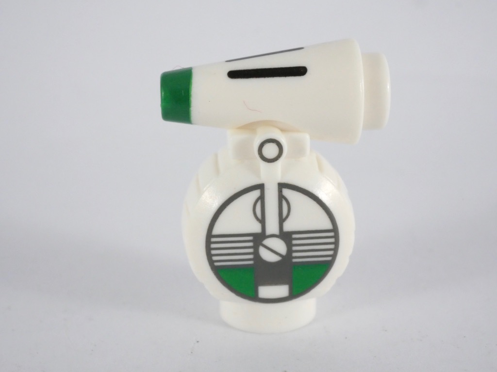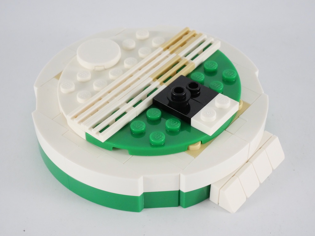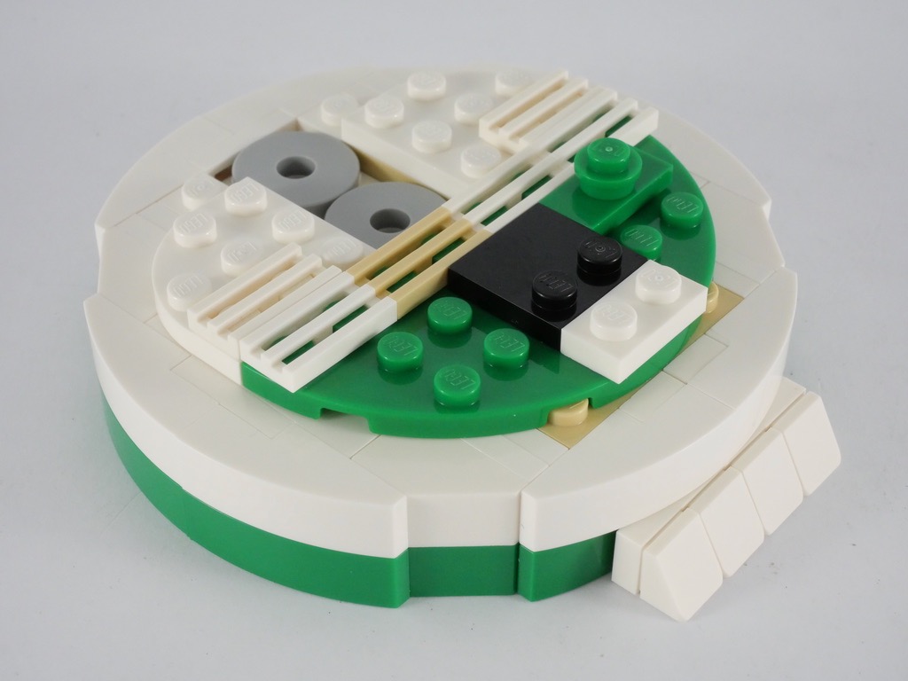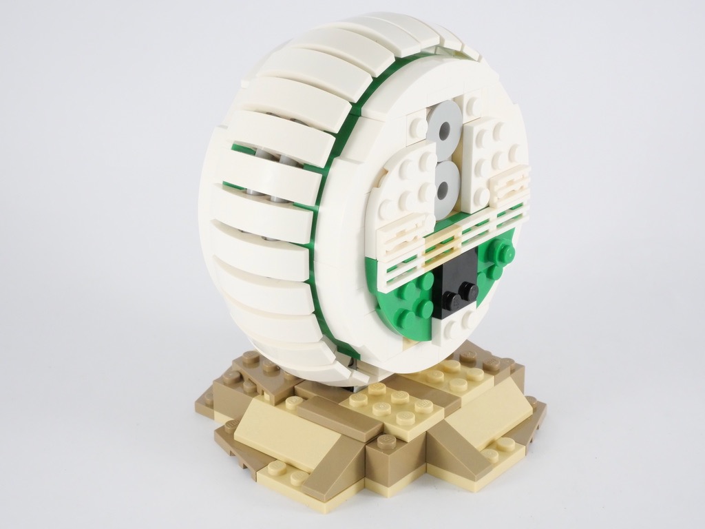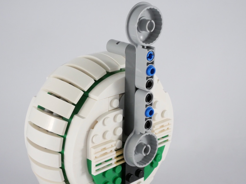 Je trouve cependant que les deux côtés de la roue auraient mérité un peu plus de travail : des tenons de briques SNOT, de couleur tan, restent légèrement visibles, et côté « bras » la partie blanche supérieure n’est pas vraiment ronde. Dans la même veine, les deux demi-cônes blancs constituant la tête auraient mérité d’être un peu plus décorés sur leur partie arrière. Et la fixation déportée de la tête n’est pas très élégante : sur le « vrai » droïde, la tête tient directement sur la partie noire située juste en dessous qui fait office de cou.