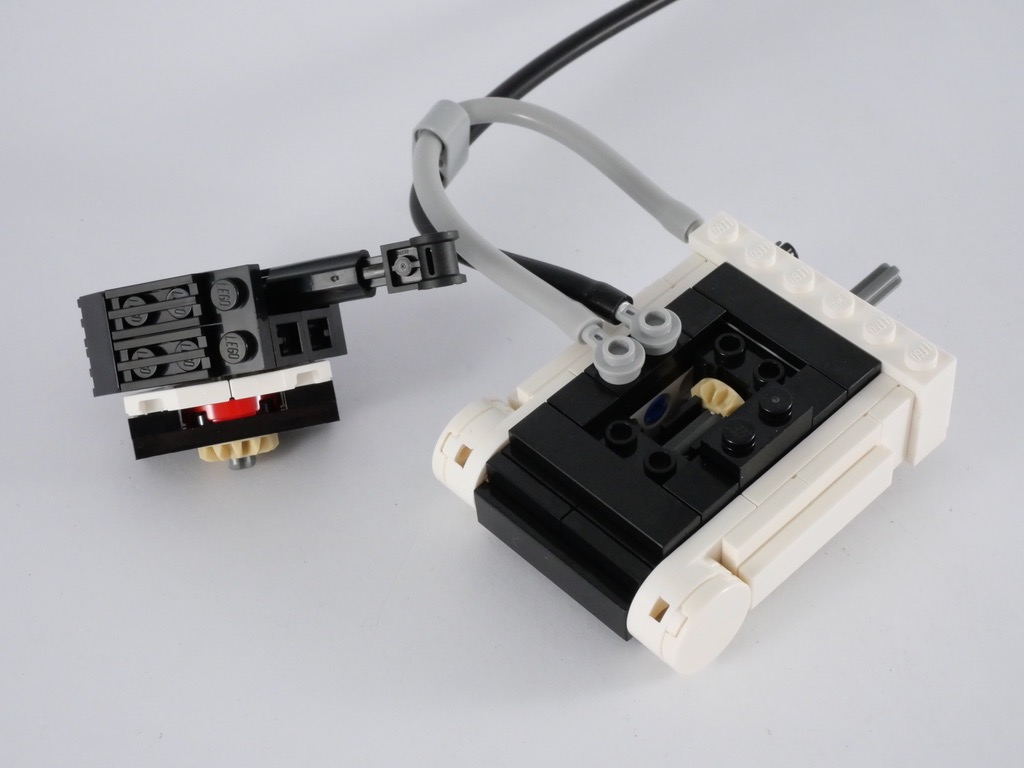 Nous continuons avec quelques pièces Technic constituant le bras reliant la partie supérieure du corps à la roue. Puis nous assemblons le petit mécanisme qui, par l’intermédiaire de deux engrenages, permettra la rotation de la tête via une molette déportée. L’ensemble est joliment maquillé, et rend le mécanisme invisible une fois la construction terminée. D’autres tubes Technic sont utilisés ici à des fins décoratives, pour reproduire les quelques câbles qui relient les deux parties du corps du droïde.