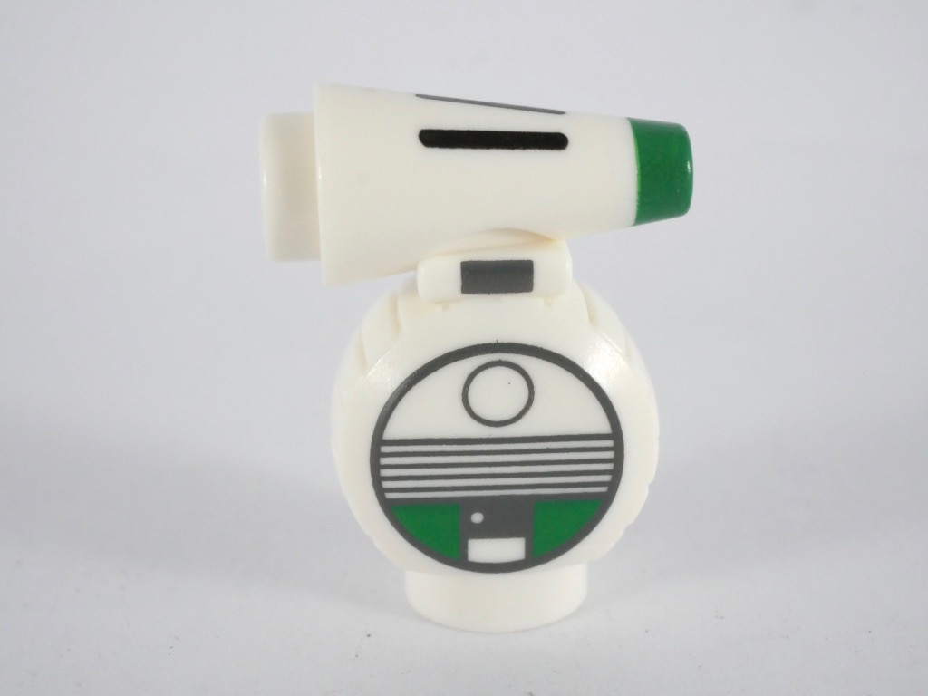 La réalisation du petit droïde est simple mais propre. Il est plutôt petit : il était difficile de faire beaucoup mieux à cette échelle tout en assurant une qualité de tampographie suffisante. Il est constitué d’une seule pièce et, faut-il le préciser, il ne roule pas. Notez que les deux faces du corps sont différentes, tout comme notre grand modèle. Il dispose d’un tenon à l’arrière de la tête auquel il sera difficile de fixer quoi que ce soit, au risque de le déséquilibrer.