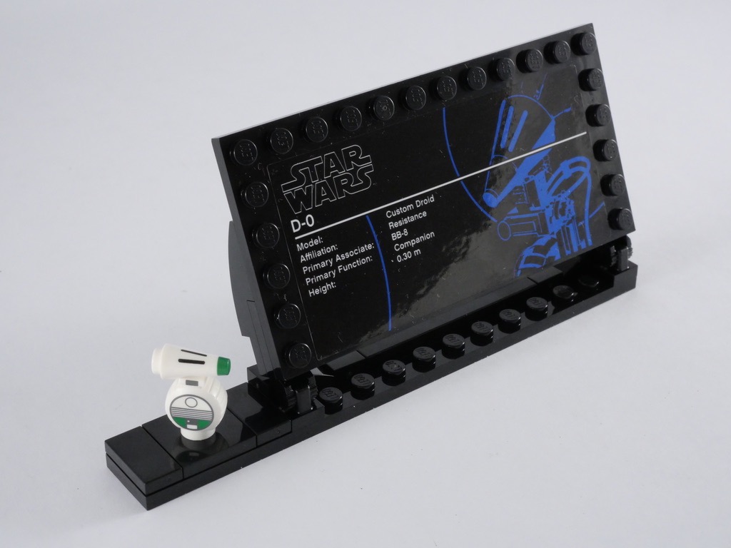 Il ne nous reste qu’à assembler la tête, constituée de 4 demi-cônes de deux couleurs différentes. La tile au bout du « nez » et les 3 grandes bandes noires sont tampographiées, fort heureusement. Une plate ronde, fixée grâce à un axe Technic traversant l’ensemble de la tête, supporte les 3 antennes et le système de fixation au reste du corps. Nous terminons notre modèle avec son support de présentation, et l’autocollant présentant quelques unes des caractéristiques du droïde. Celles-ci sont d’ailleurs assez anecdotiques et auraient certainement mérité un peu plus d’attention pour un produit destiné à être exposé.