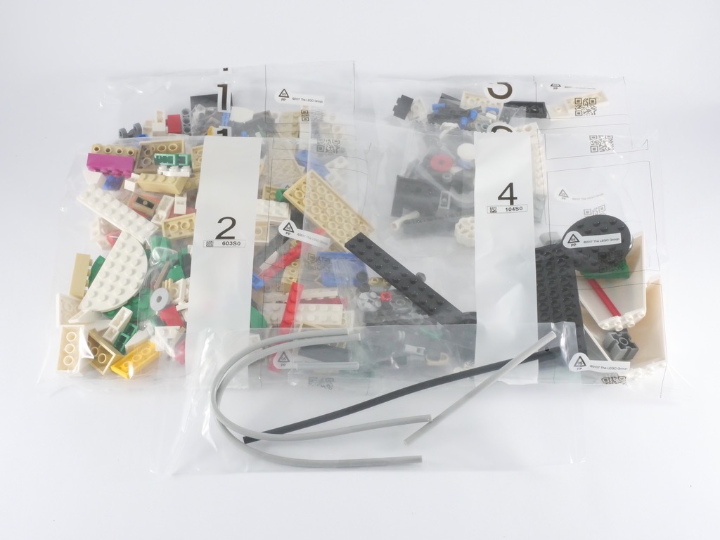 A l’intérieur, nous trouvons 4 sachets de pièces numérotés, et un cinquième contenant quelques tubes souples habituellement utilisés dans les modèles Technic pneumatiques. On trouve également une notice d’instructions de 72 pages pour 157 étapes de construction, et un unique autocollant pour la plaque de présentation.