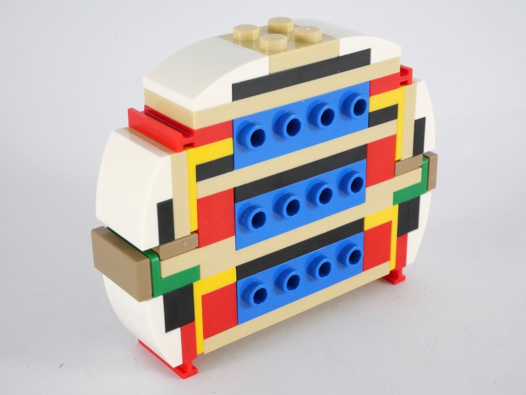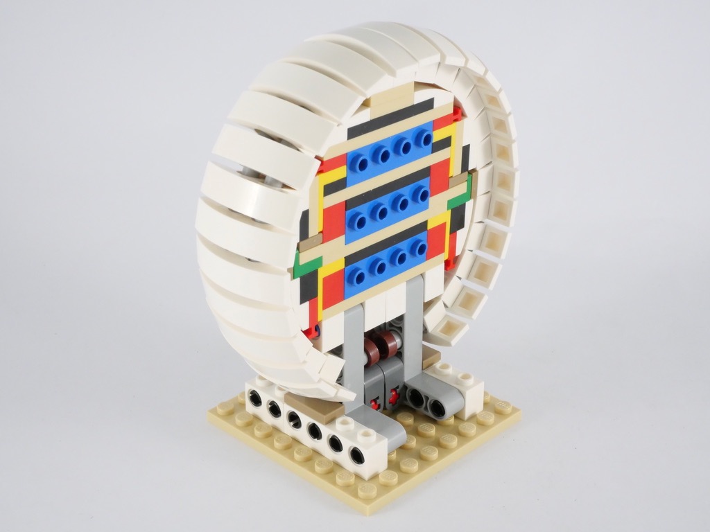 Nous commençons par la construction de la partie centrale, située à l’intérieur de la roue. Celle-ci est constituée pour l’essentiel de briques SNOT, de sorte à pouvoir décorer les deux faces par la suite. Nous construisons alors la roue, dont la conception est intéressante : elle est basée autour de deux tubes Technic habituellement utilisés dans les modèles pneumatiques de la gamme, sur lesquelles viennent s’enfiler, comme des perles, les éléments constitutifs de la roue. On la fixe ensuite autour du corps préalablement assemblé, puis sur une plate. Tous les éléments prennent plutôt bien leur place, et demandent peu d’ajustement pour équilibrer les espacements. Les tubes restent légèrement visibles une fois le modèle assemblé. Et vous l’aurez compris : la roue ne tourne pas.