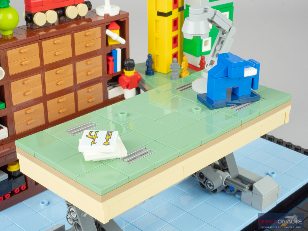 Hormis le socle d’exposition qui pourra s’avérer un peu rébarbatif, la construction est un véritable régal. Les éléments qui composent le set sont si variés qu’on ne trouve pas le temps de s’ennuyer. On passe ainsi de la construction d’un meuble à une mini-construction, en passant par l’établi et les éléments Technic qui lui offrent la possibilité de s’abaisser / se lever à l’aide du levier situé sur le côté. C’est d’ailleurs la seule vraie « fonctionnalité » du set – mais la jouabilité n’est clairement pas l’objectif d’une telle boîte.