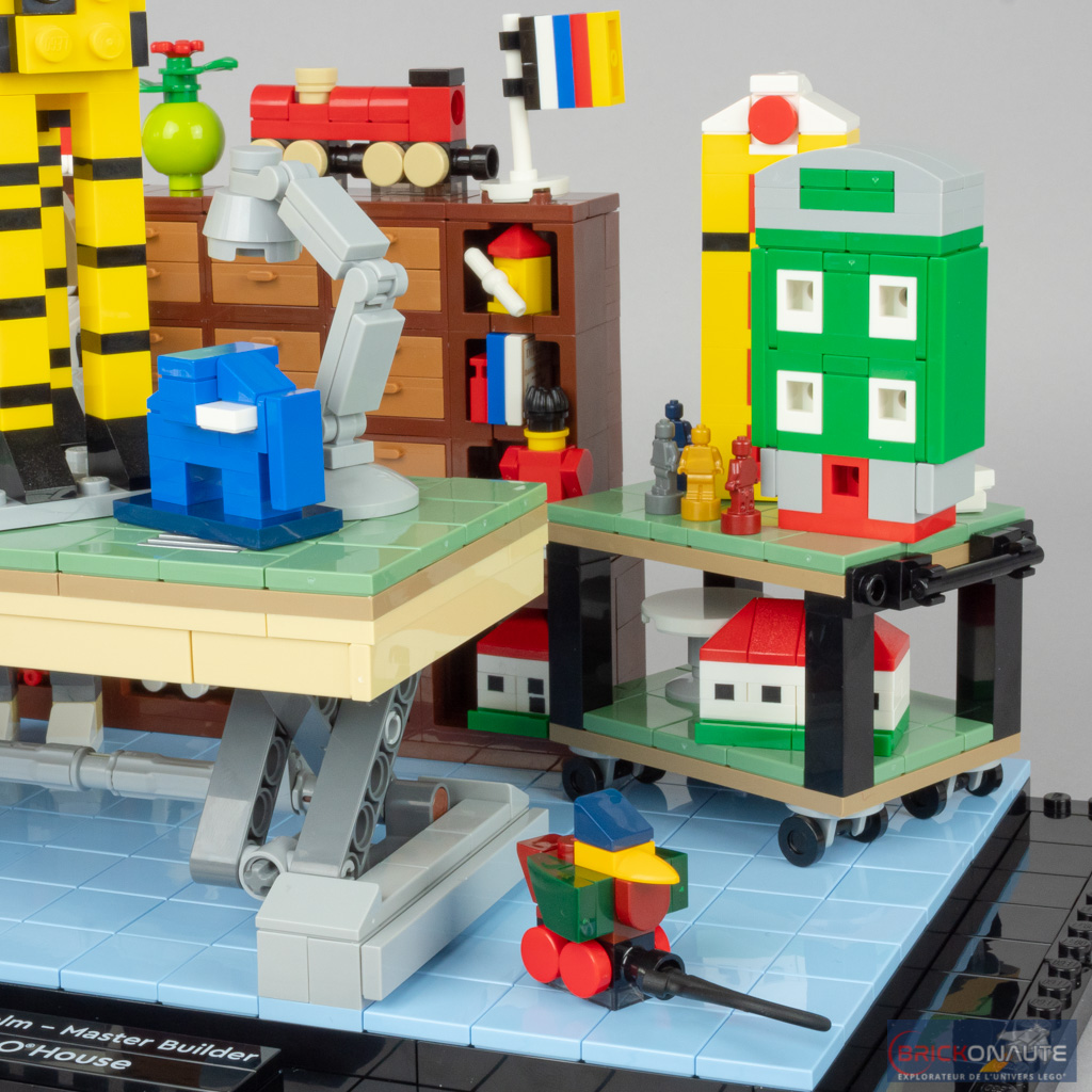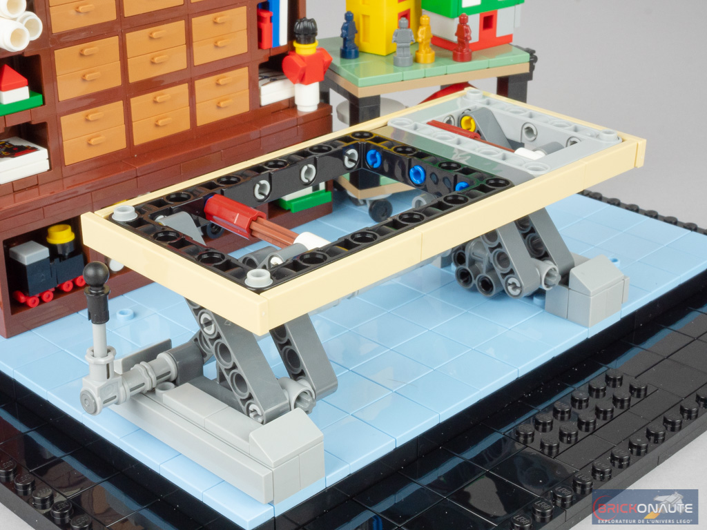 Hormis le socle d’exposition qui pourra s’avérer un peu rébarbatif, la construction est un véritable régal. Les éléments qui composent le set sont si variés qu’on ne trouve pas le temps de s’ennuyer. On passe ainsi de la construction d’un meuble à une mini-construction, en passant par l’établi et les éléments Technic qui lui offrent la possibilité de s’abaisser / se lever à l’aide du levier situé sur le côté. C’est d’ailleurs la seule vraie « fonctionnalité » du set – mais la jouabilité n’est clairement pas l’objectif d’une telle boîte.